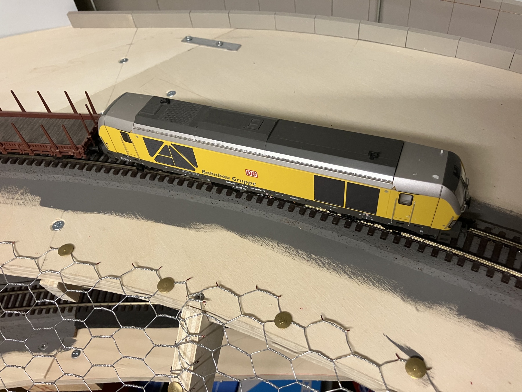 Wat me opvalt aan de bovenrand, waar de locomotief staat, is dat het gaas zich al op maaiveldhoogte lijkt te bevinden. Als dadelijke de afwerking er overheen is, is er dan nog iets te zien van de railbedding? Het kan natuurlijk aan vertekening op de foto liggen.
