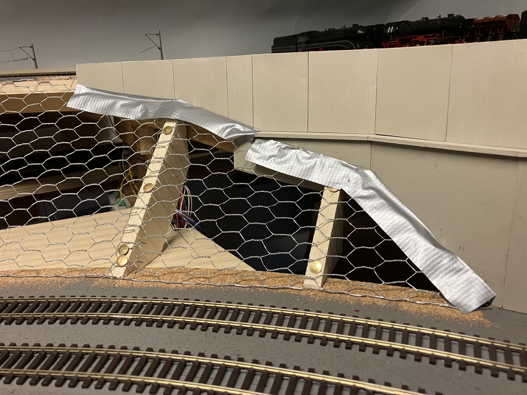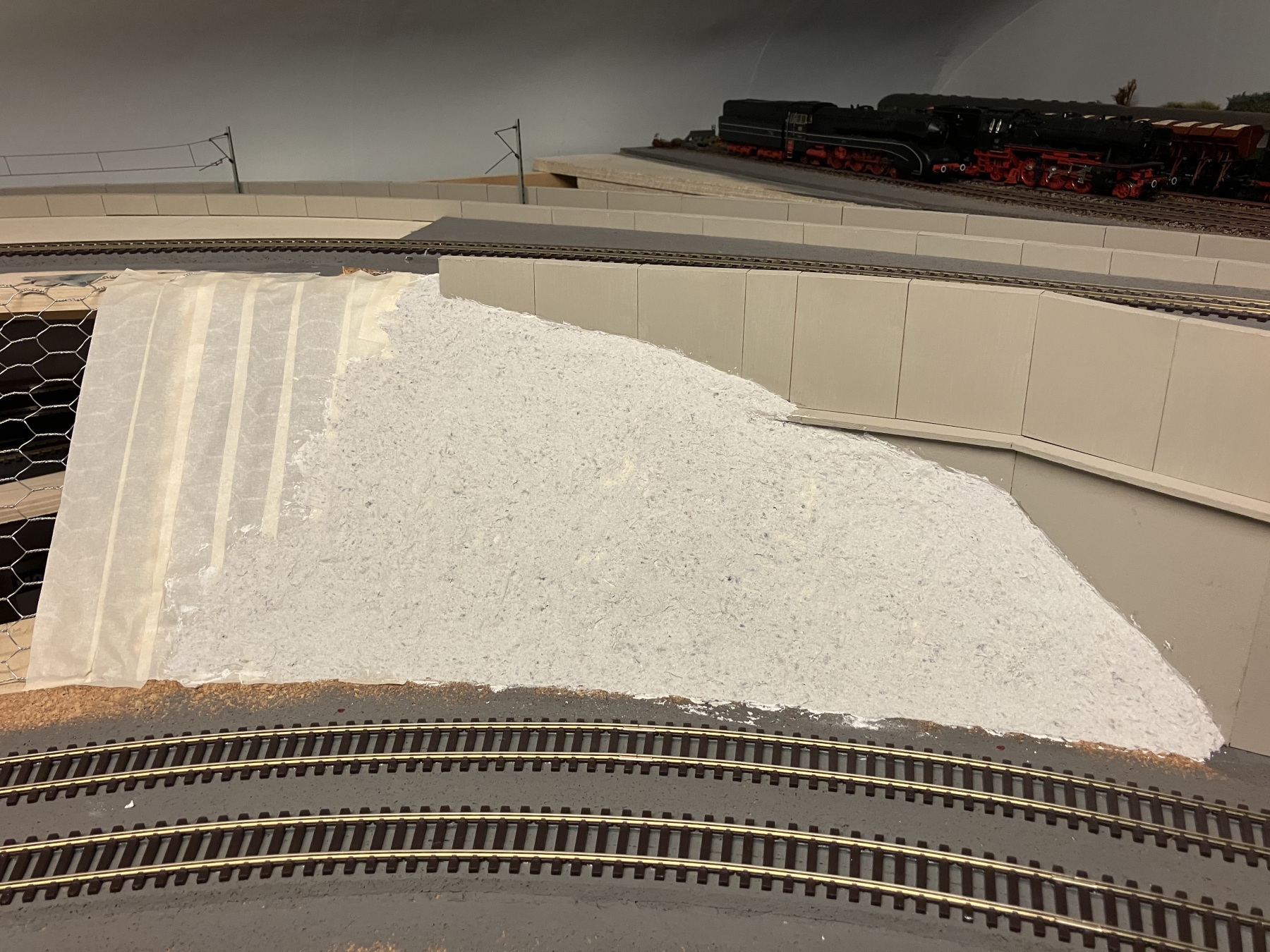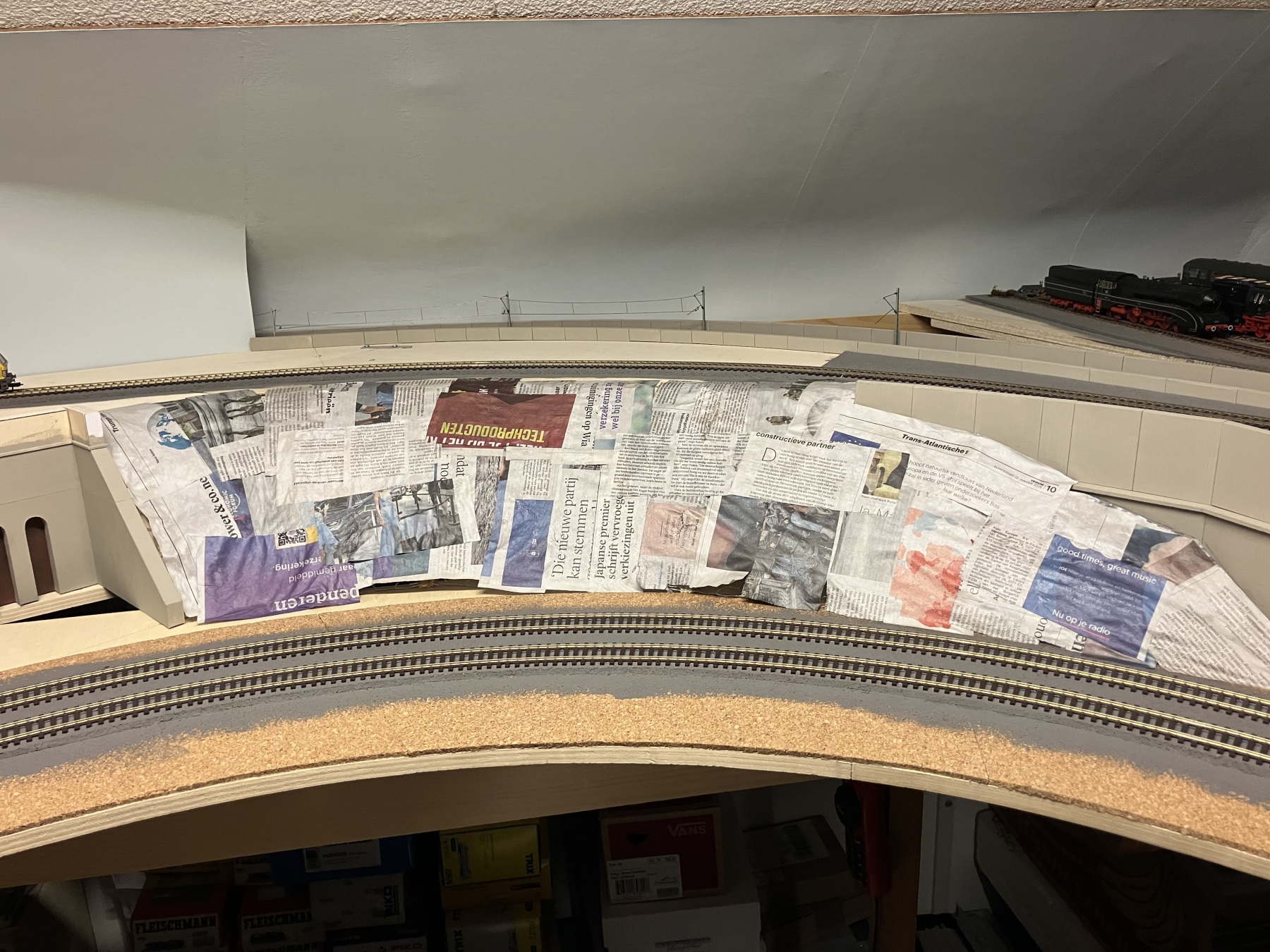 Wat me opvalt aan de bovenrand, waar de locomotief staat, is dat het gaas zich al op maaiveldhoogte lijkt te bevinden. Als dadelijke de afwerking er overheen is, is er dan nog iets te zien van de railbedding? Het kan natuurlijk aan vertekening op de foto liggen.