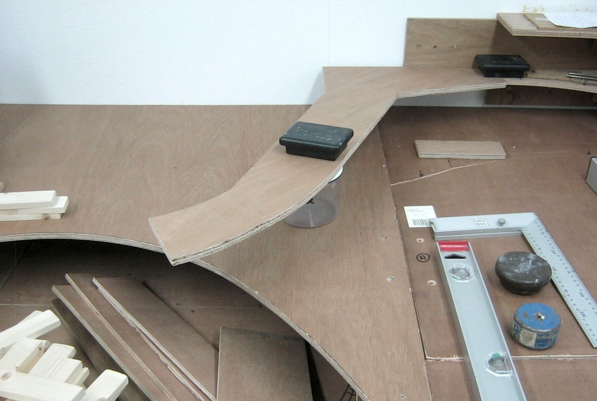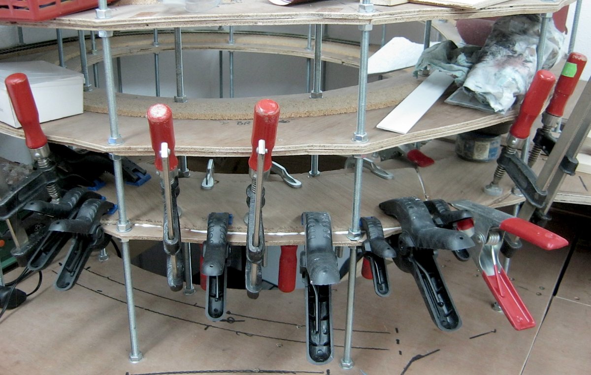 Een gedeelte van de helix is pas op halve dikte. Multiplex van 6 mm erop gelijmd, flink vastklemmen, en het is weer geregeld en nu drogen maar.