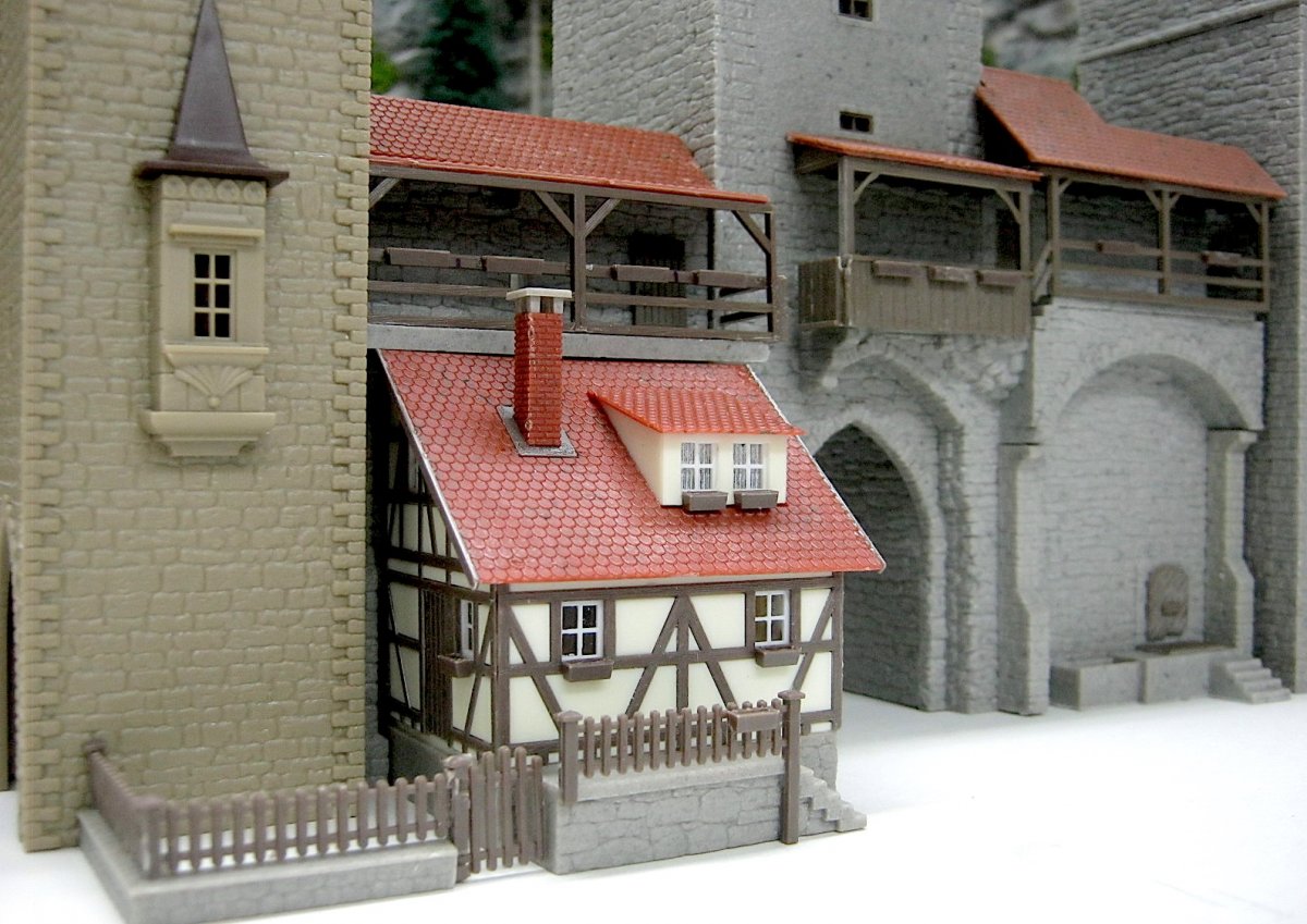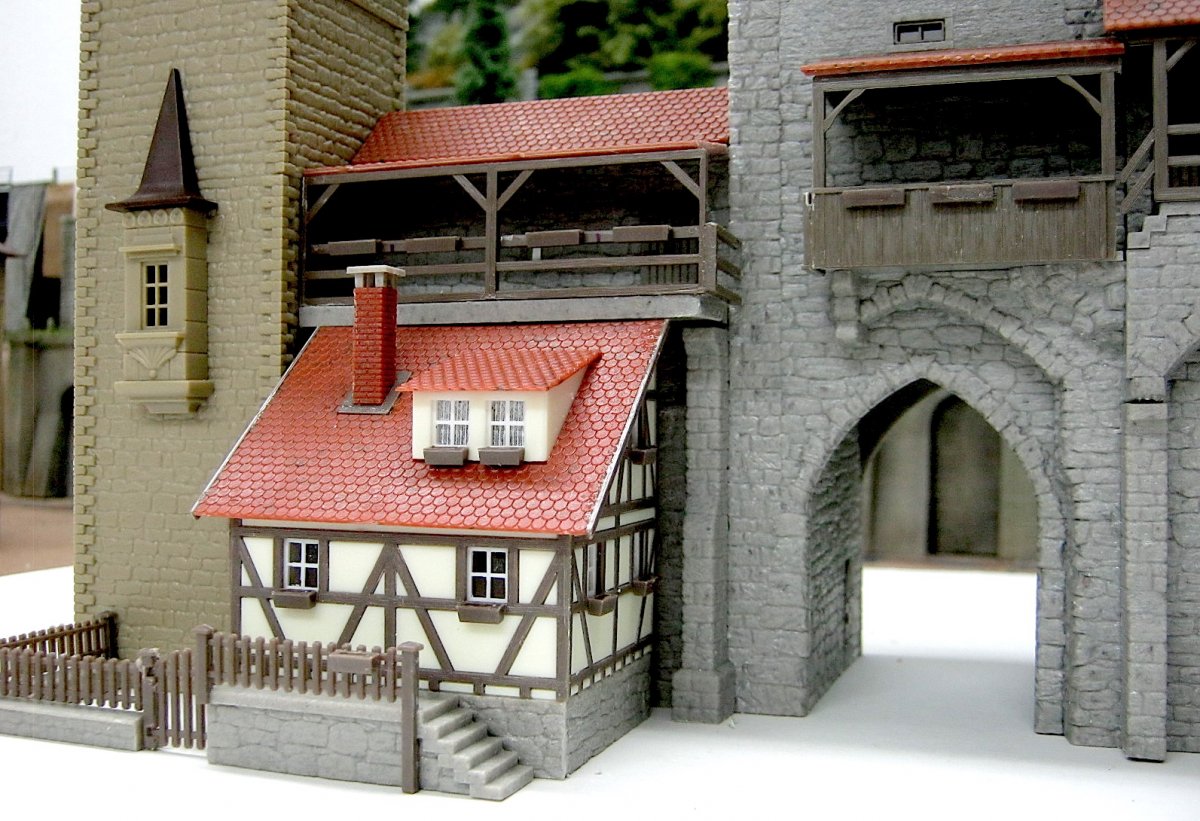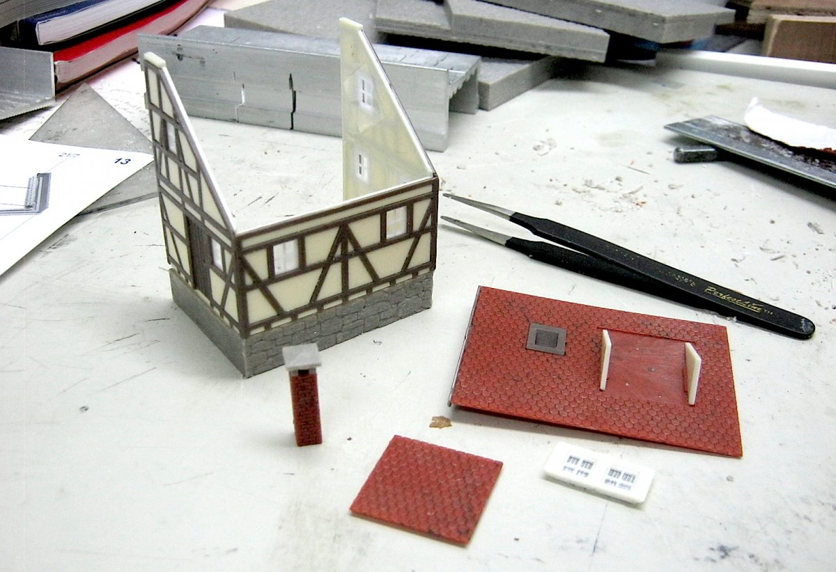 Zo beginnen met nog wat extra details, het koddige huisje en de daken van de torens.