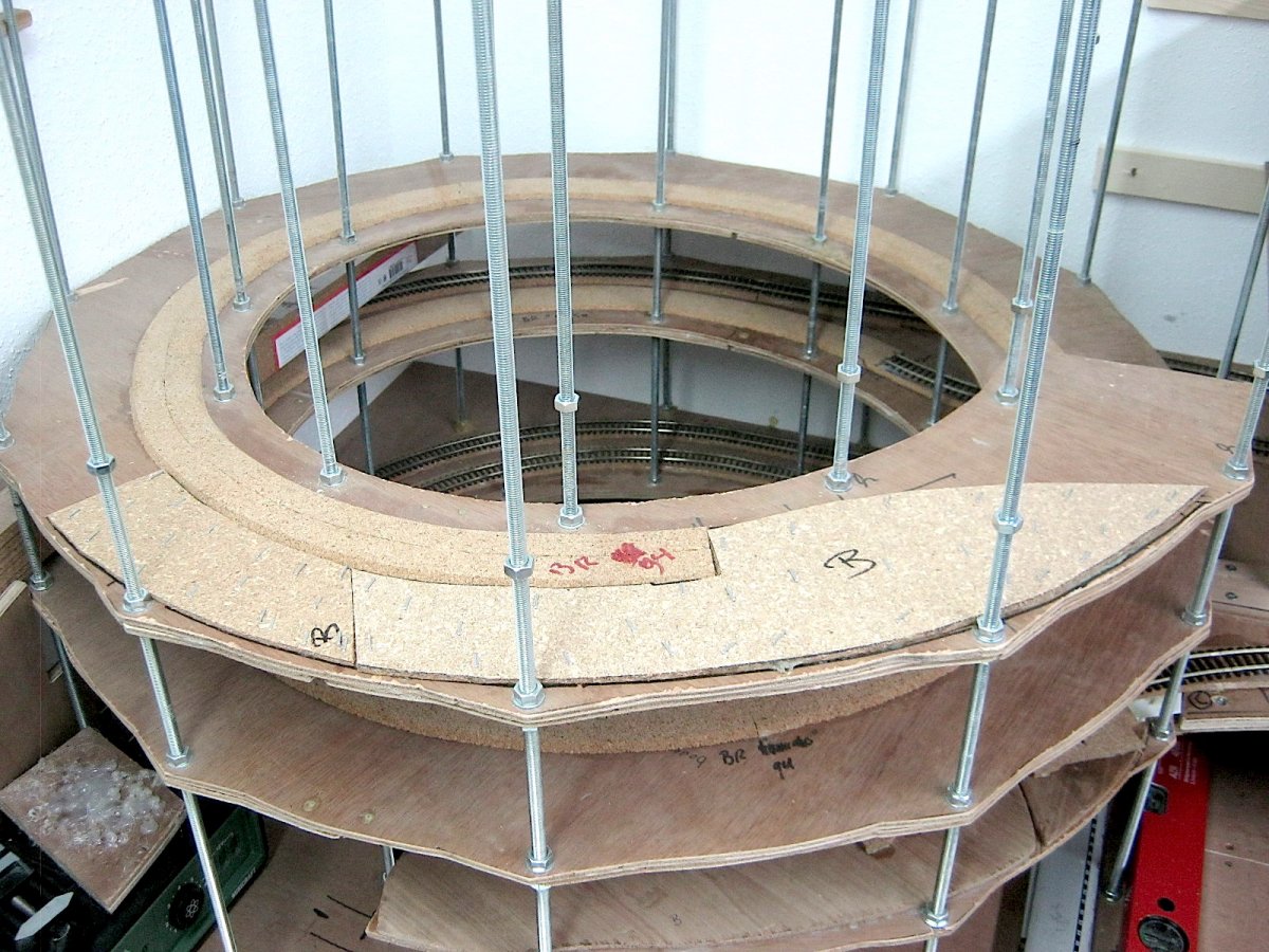 Twee stukken kurk isolatie (B) ruim aangebracht omdat ik nog niet precies weet waar de rails geplaatst gaat worden. En beter teveel kurk dan te weinig. De kurk met Bisom tix gelijmd en met krammen vastgezet tot de lijm droog is.