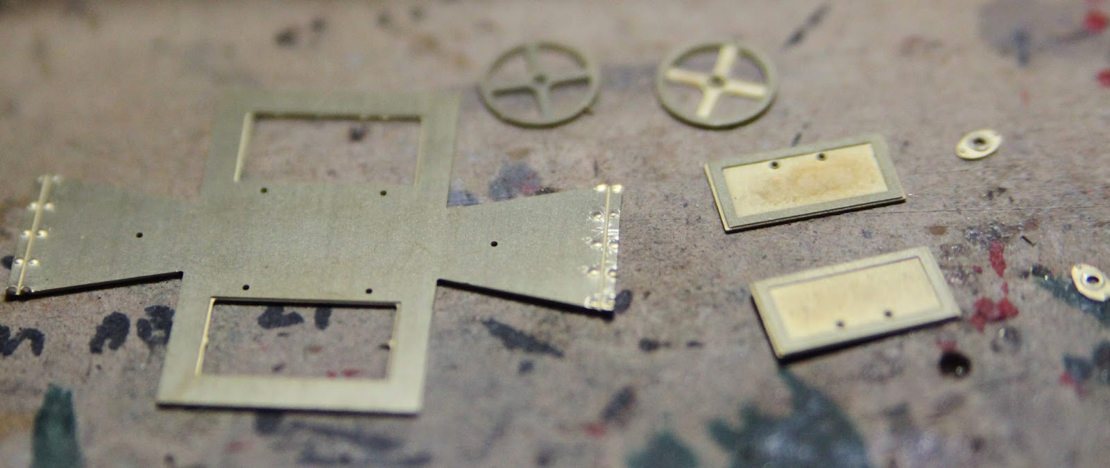 Verder het "makkelijkst" werkt het met de aspotten, eerst de 4 delen op elkaar solderen, op de frameplaten solderen, gaatjes opboren met 0,5mm , imitatiebouten erin, weer solderen en klaar...