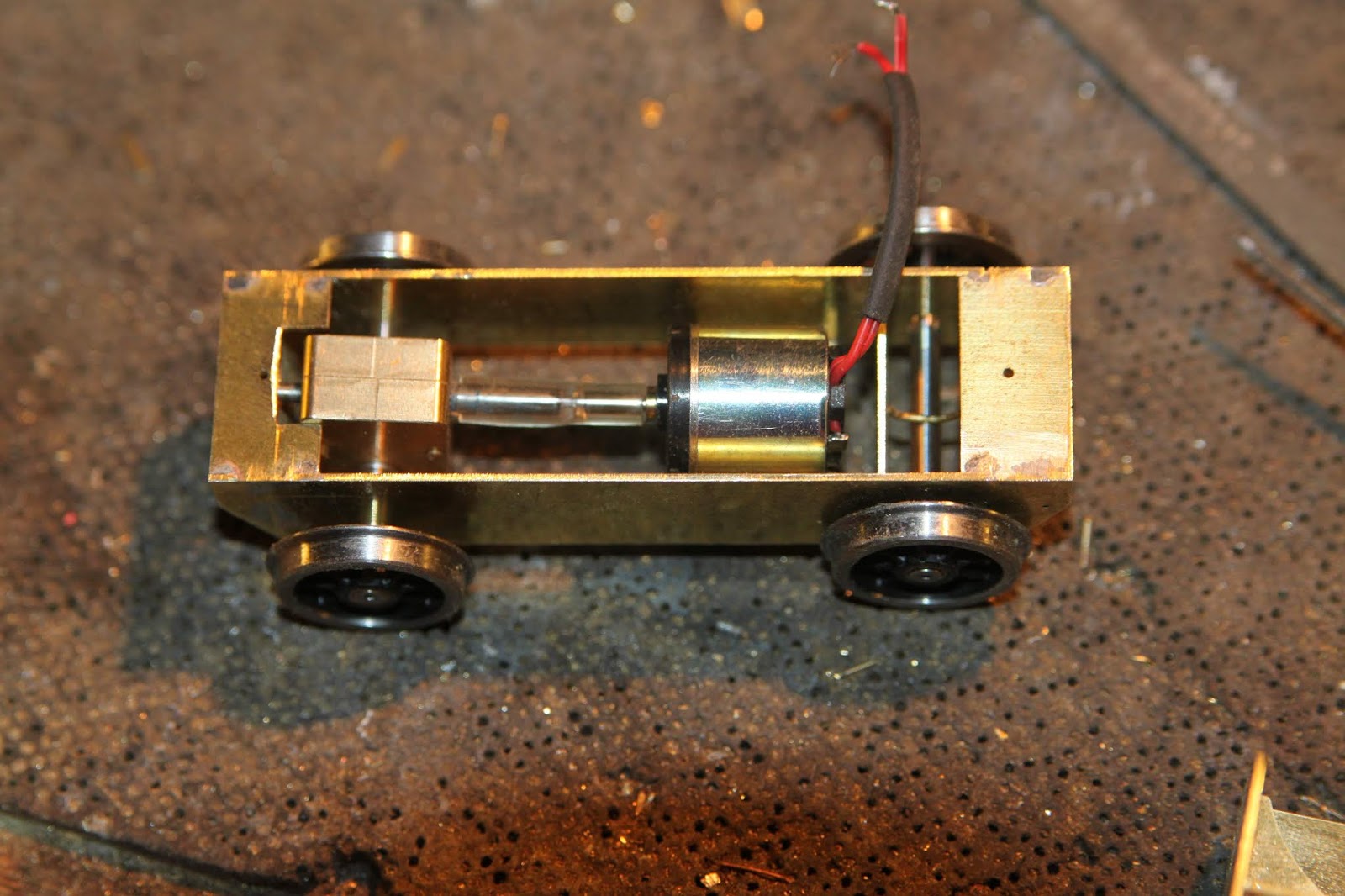 Ik had weliswaar niet zo'n geavanceerde aandrijving (2-stage-gearbox) als Frits heeft gebruikt, maar ik had wel een klein Mashima motortje dat rechtop in de motorhuif paste en ik had tijdens Rail 2018 daarvoor een Romford aandrijving gekocht (tandwiel en wormwiel).