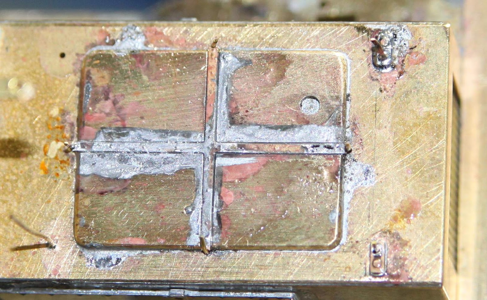 Verder het "makkelijkst" werkt het met de aspotten, eerst de 4 delen op elkaar solderen, op de frameplaten solderen, gaatjes opboren met 0,5mm , imitatiebouten erin, weer solderen en klaar...