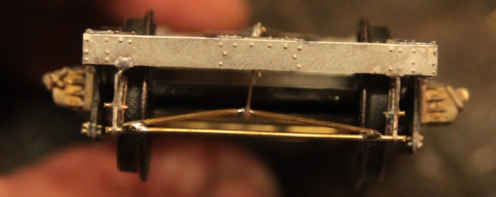 Begonnen om een strip 1x3 mm op de bodemplaat te solderen. De markeringspuntjes houd ik aan al locatie waar de buitenste coupéwand bovenop komt te staan.