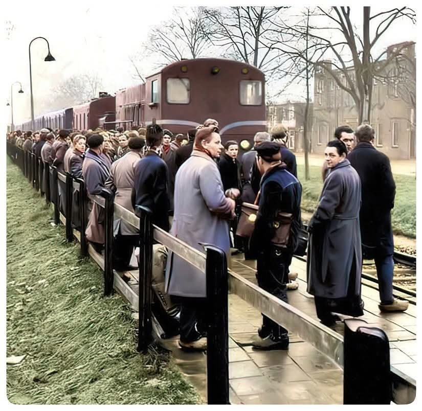 Spoorweghalte Achter de Hoven voor de klompentrein, bij de overweg Pieter Stuyvesantweg 1963. Ingekleurd door duo Andringa & Glim.