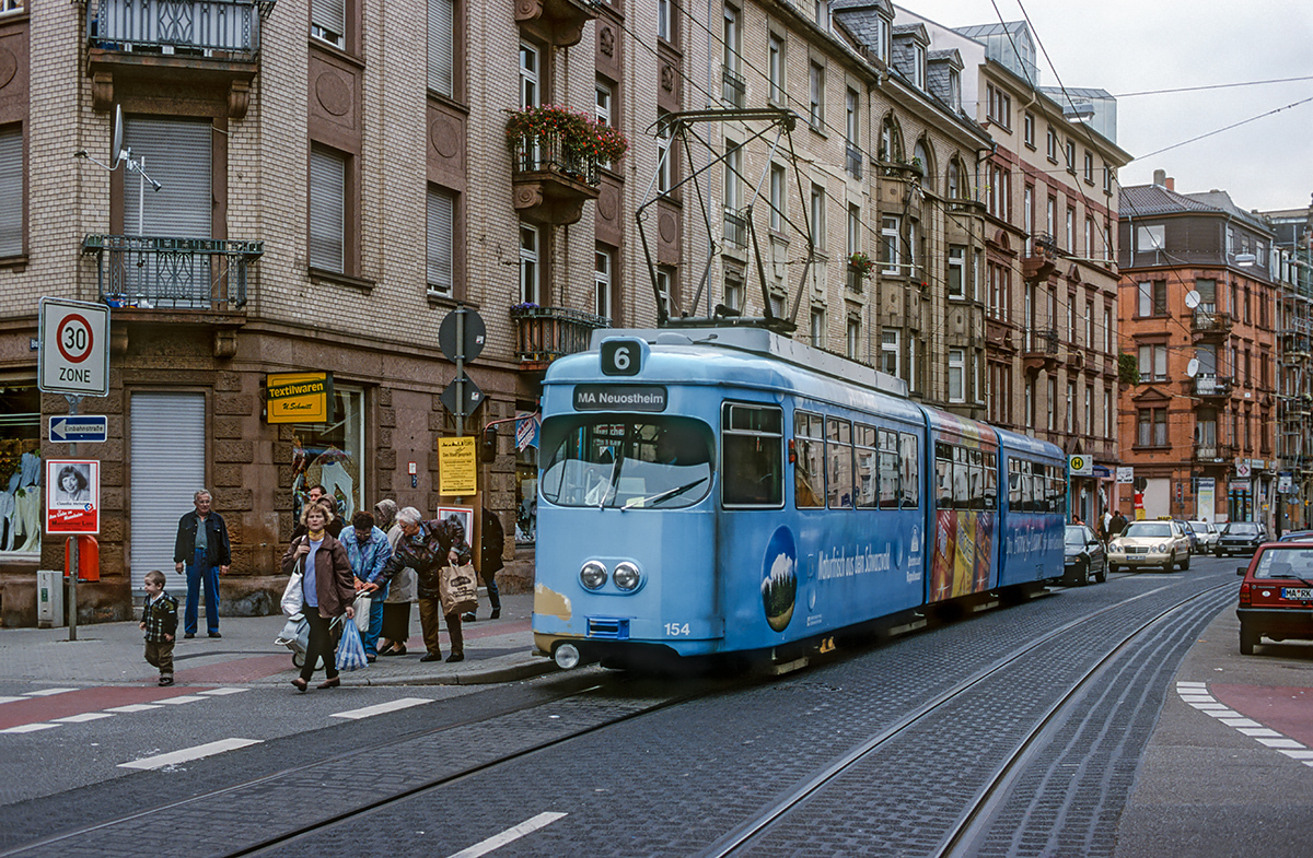 Seckenheimer Strasse bij de halte Weberstrasse. Dubbelgelede Düwag 154 is in 1971 aan de tram van Ludwigshafen geleverd.