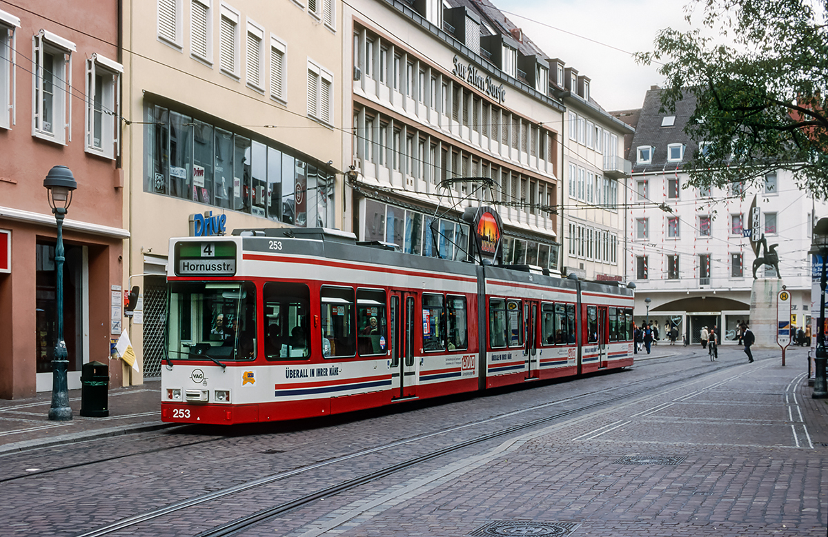Bertoldstrasse met een van de lagevloertrams van de serie 241 - 266, die Duewag in 1993/1994 leverde.