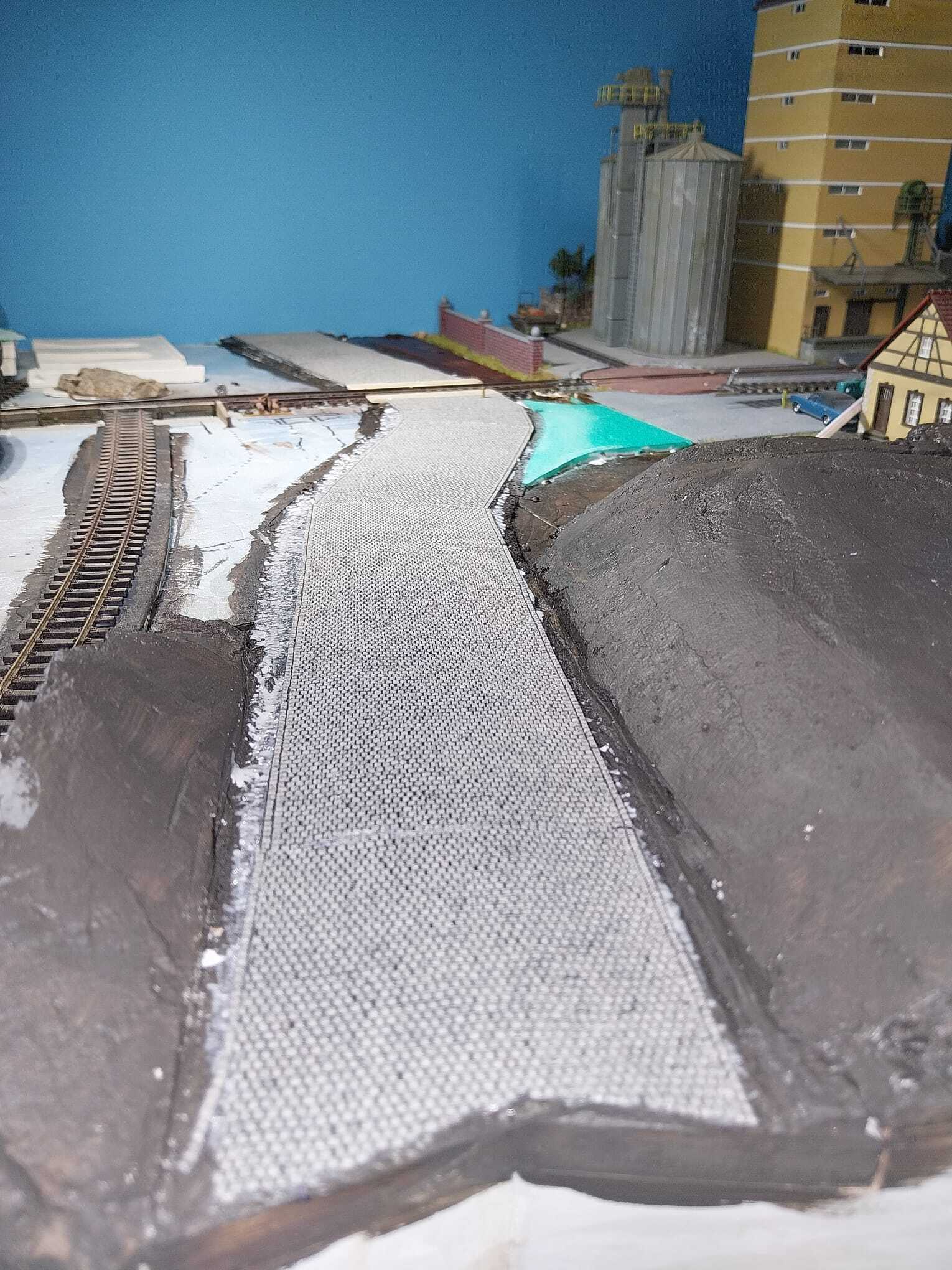 Zo past de weg mooi op de ondergrond. De ondergrond is van laminaat ondervloer gemaakt en een beetje rond gevijld. Zo krijg je eenvoudig de bolling in de weg.