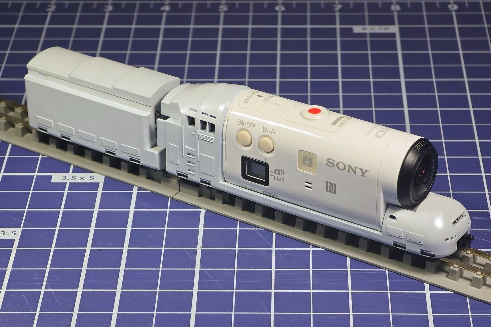 Wat we helemaal over het hoofd hebben gezien is de Sony HDR-AZ1. Een compact cameraatje, de grootte van een kleine H0 modeltrein (63,5 x 24,5 x 36 mm). Deze heb ik 2e hands kunnen vinden voor €71.50 (nieuw €250) en ik heb er een wagentje voor geprint met PLA (plastic), zodat het op mijn baan geduwd kan worden. Ik zal het ontwerp van het wagentje ook nog wel op mijn website als gratis download zetten, voor een ieder die ook zo'n camera heeft of gaat vinden.