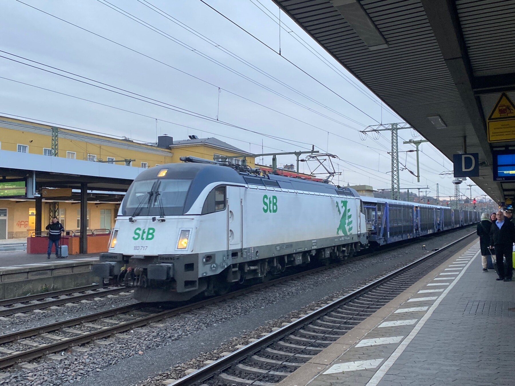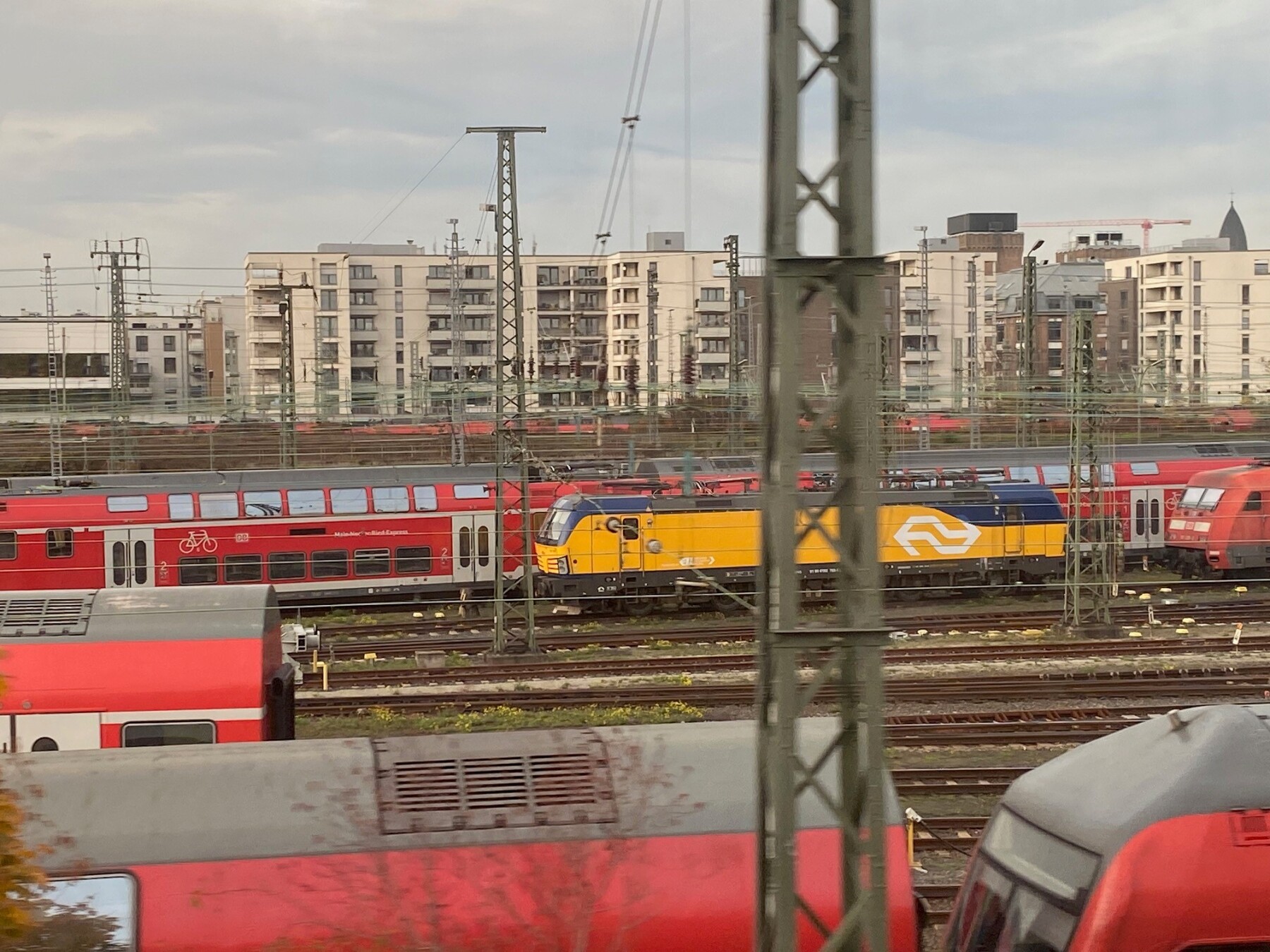 En dan zijn we in Fulda aan de noord-zuid verbinding met heel veel goederenverkeer ook op de rails. Deze stier mocht een tijd niet verder, werd ingehaald door diverse andere treinen.