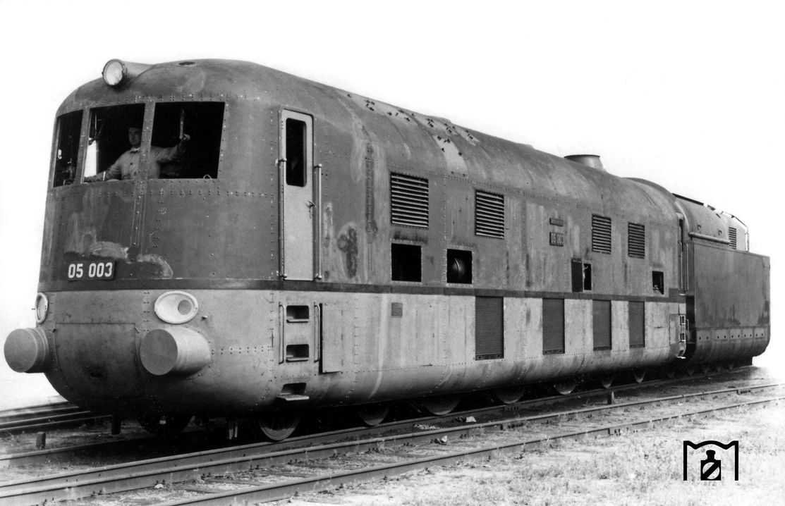 Die mit den Lokomotiven der Baureihe 05 angestrebten Fahrgeschwindigkeiten warfen die Frage auf, ob bei der traditionellen Anordnung des Führerhauses eine ausreichende Streckensicht gewährleistet ist. Daraufhin wurde die 05 003 als Erprobungsträger mit vorn angeordnetem Führerhaus konzipiert. Dazu wurde die gesamte Lokomotive gedreht, um Lokführer und Heizer nicht trennen zu müssen. Die Lok lief also mit dem Stehkessel voraus, der Tender hinter der Rauchkammer. Wegen der Rohstofflage des Deutschen Reiches wurde eine Ölfeuerung verworfen und Feuerung mit Steinkohlenstaub entwickelt. Der Kohlenstaub wurde von einer dampfgetriebenen Turbine mittels einer 14 m langen Leitung vom Tender bis zur Feuerbüchse geblasen. Die Aufnahme der Kohlenstaub-Maschine entstand kurz nach ihrer Fertigstellung im unfertigen Anstrich bei den Borsig-Werken in Hennigsdorf/Kr Osthavelland. (1937) Foto: RVM (Werkfoto)