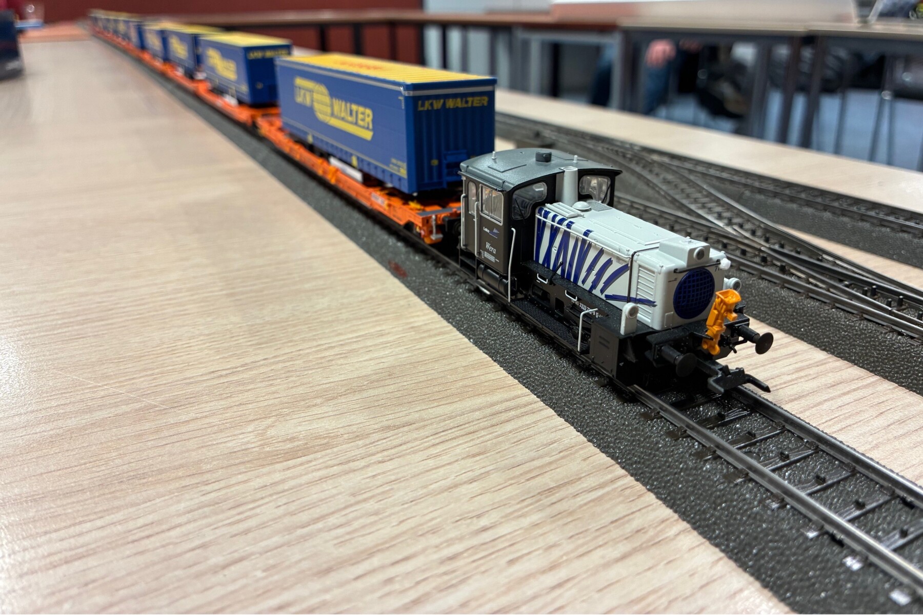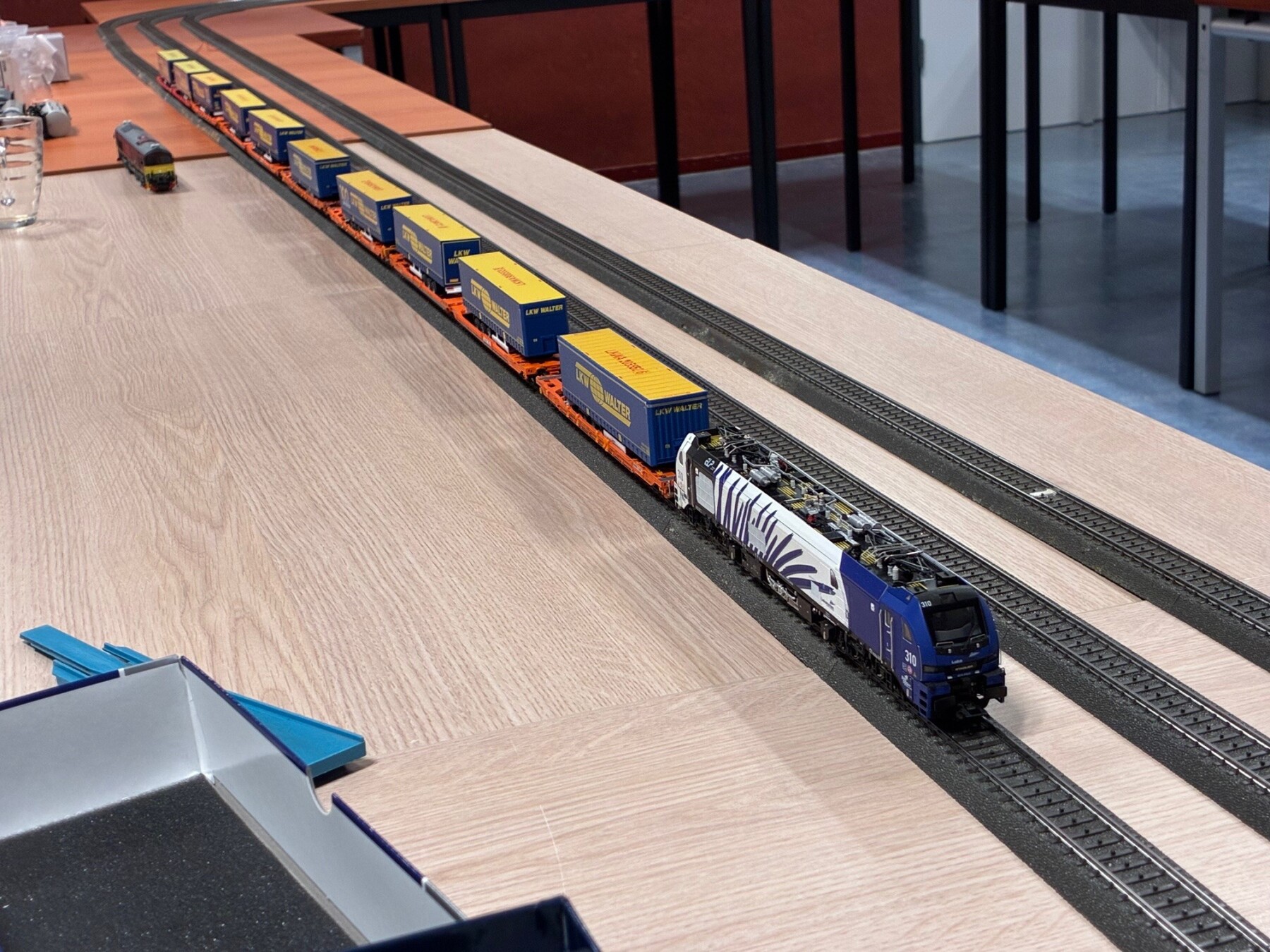 En dan mochten de loks ook nog wat meters maken, de Euro9000 als eerste met een "KLV" trein. Voor thuis is deze trein veel te lang, op de stamtafel past hij prima, hoewel in het grootbedrijf deze treinen nog veel langer zijn.