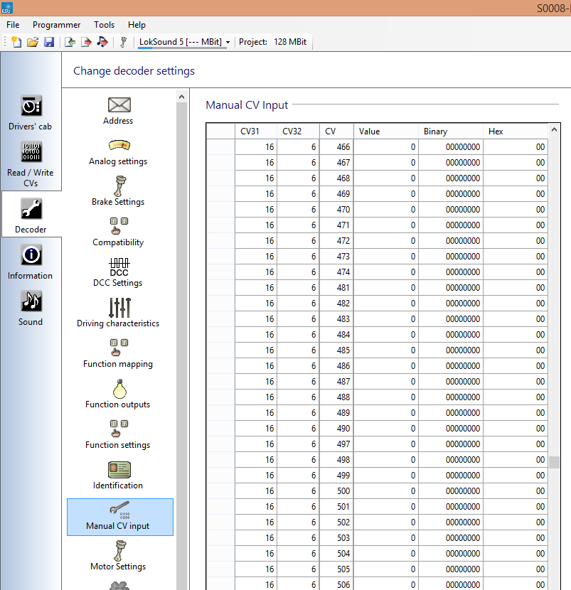 De titel; komt omdat ik al eerder met een Lsound 4 in de weer was. Maar als de software wijzigingen voorstelt op een bepaalde cv waarde geeft dat aan wat de nieuwe waarde moet worden. Ik zag zojuist bij het testen en uitlezen dat sommige voorgestelde wijzigingen (uitgaande van de standaardinstellingen in de Lokpr.software voor ik wat wijzig) niet nodig waren omdat de cv al de voorgestelde waarde had, meteen ná een reset. De Lokprogrammer software weet dus blijkbaar niet goed wat de cv-waarden zijn na een reset. Toch raar...