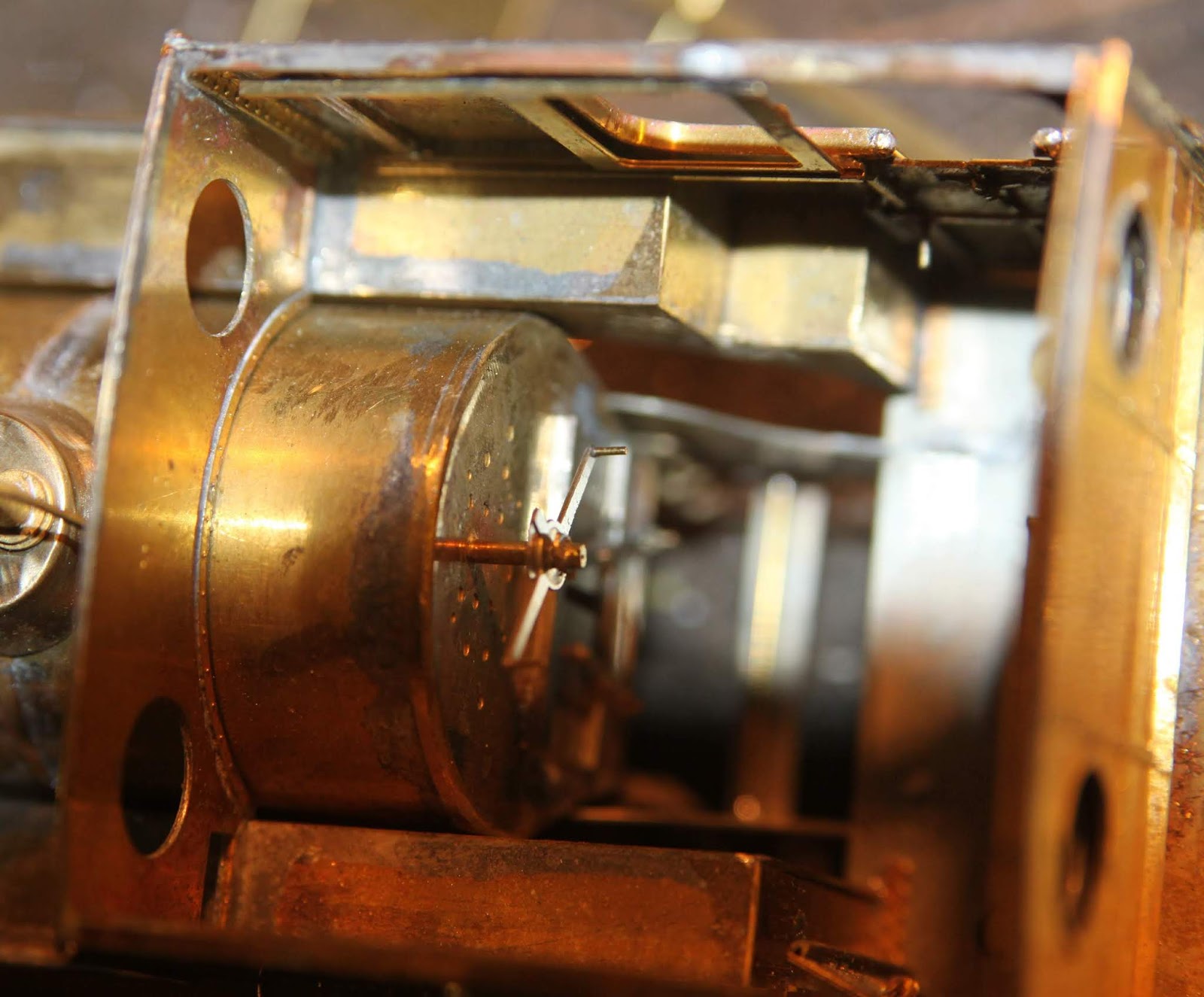 Verder de ketelbanden vastgebakken, ook heb ik toch uit de rommeldoos klinknagelstrips op de voetplaat naast / tegen het machinistenhuis gesoldeerd. Kwam ik later ook pas achter, dar op een enkele foto dat toch te zien was.