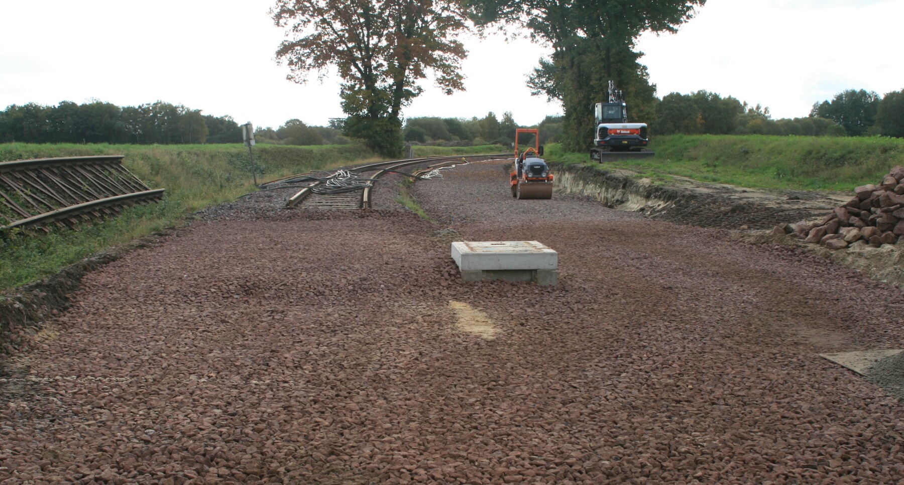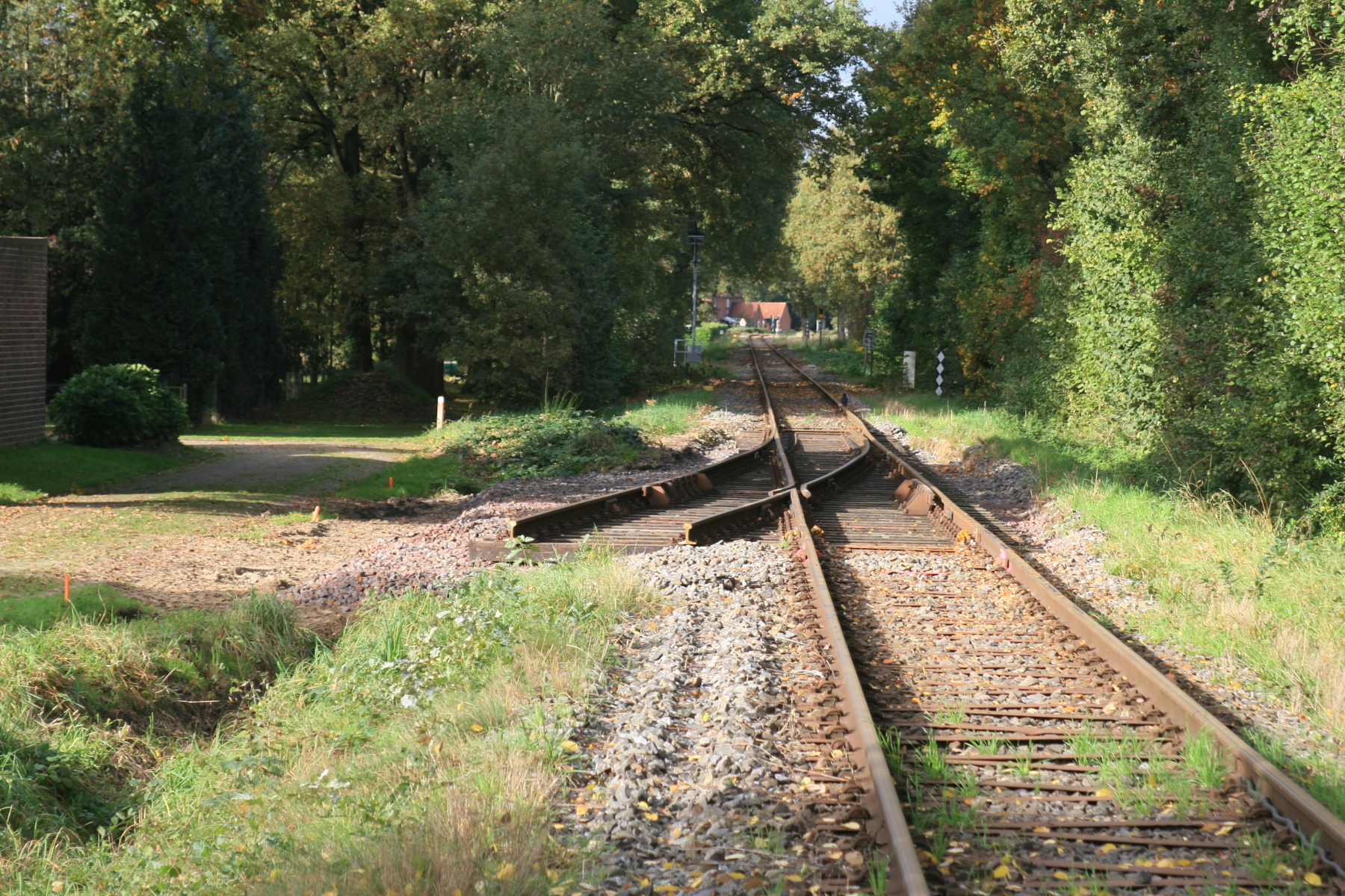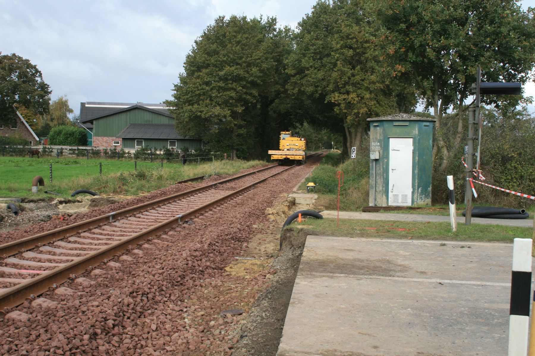 2773 In het verleden kruisten hier de goederentreinen van de Bentheimer Eisenbahn de K14. W&W hebben de oude rails opgenomen en gaan deze vervangen door nieuwe rails op betonnen dwarsliggers. Gelijktijdig zal het wegdek worden vernieuw en komen er halve overwegbomen. De overweg zal aangestuurd worden door de trein via schakelaars tussen de rails.