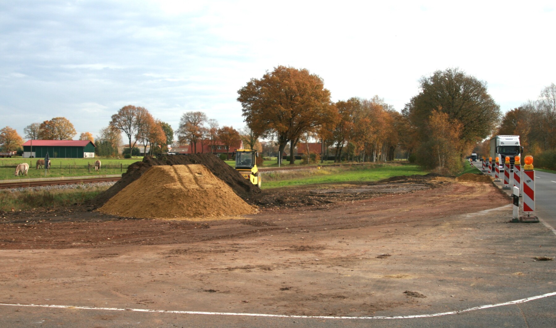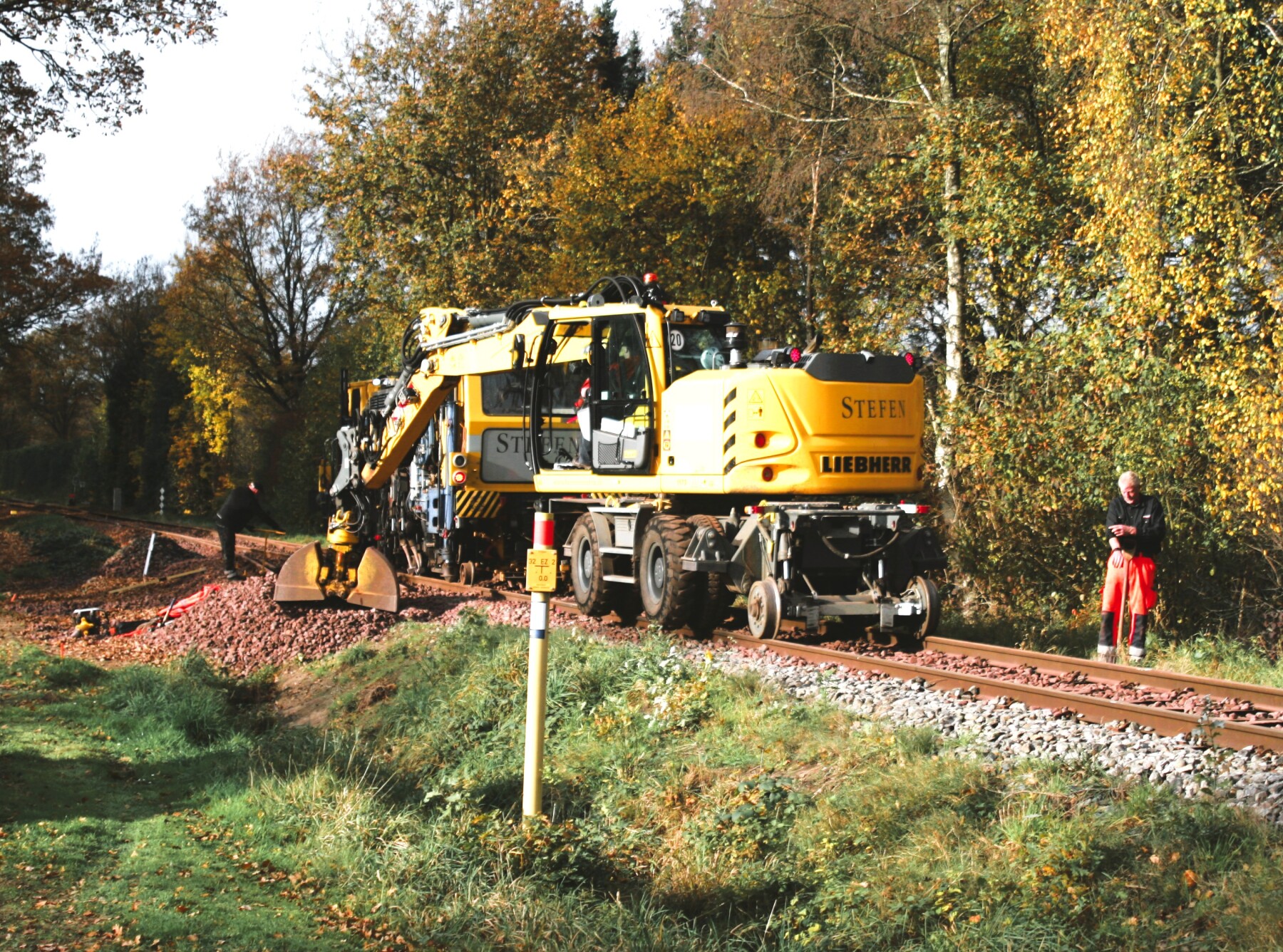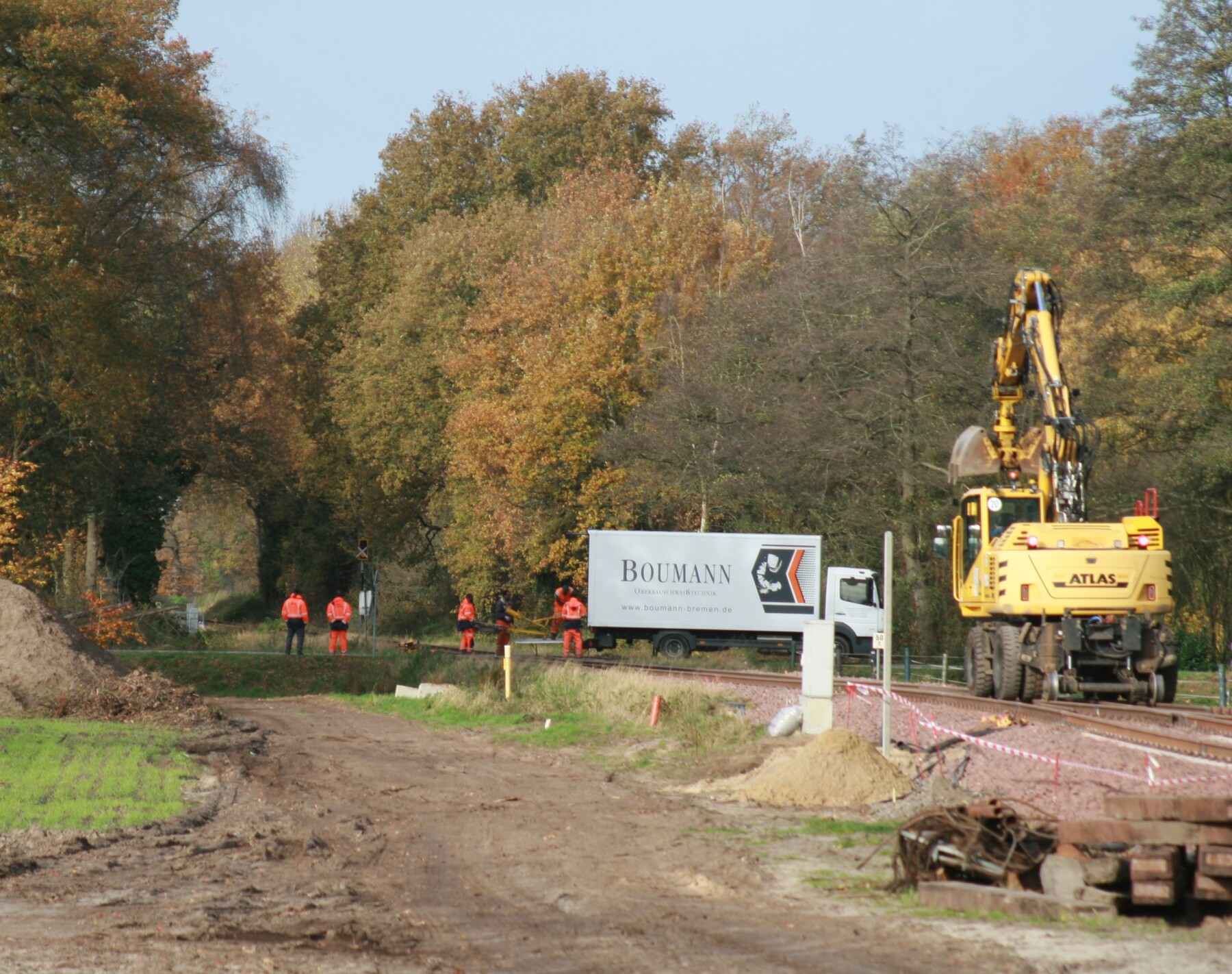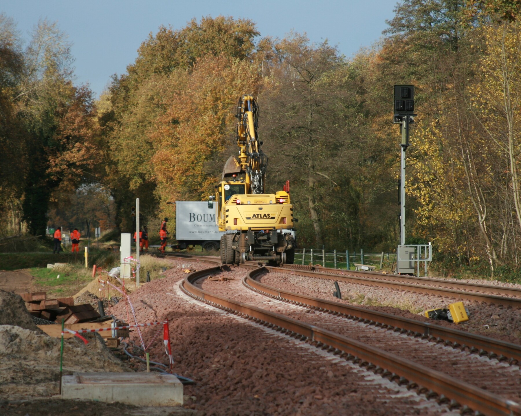 3037-2029 Het was mij opgevallen dat er de laatste weken bij de overweg in de Volzeler Feldstrasse druk gewerkt word. Er stond een “bagger” en er lag een grote hoop grond en ballast