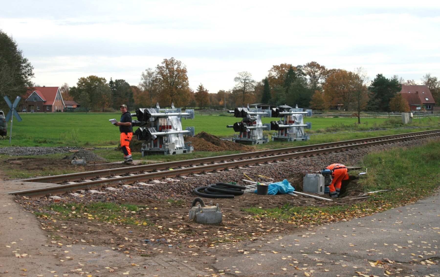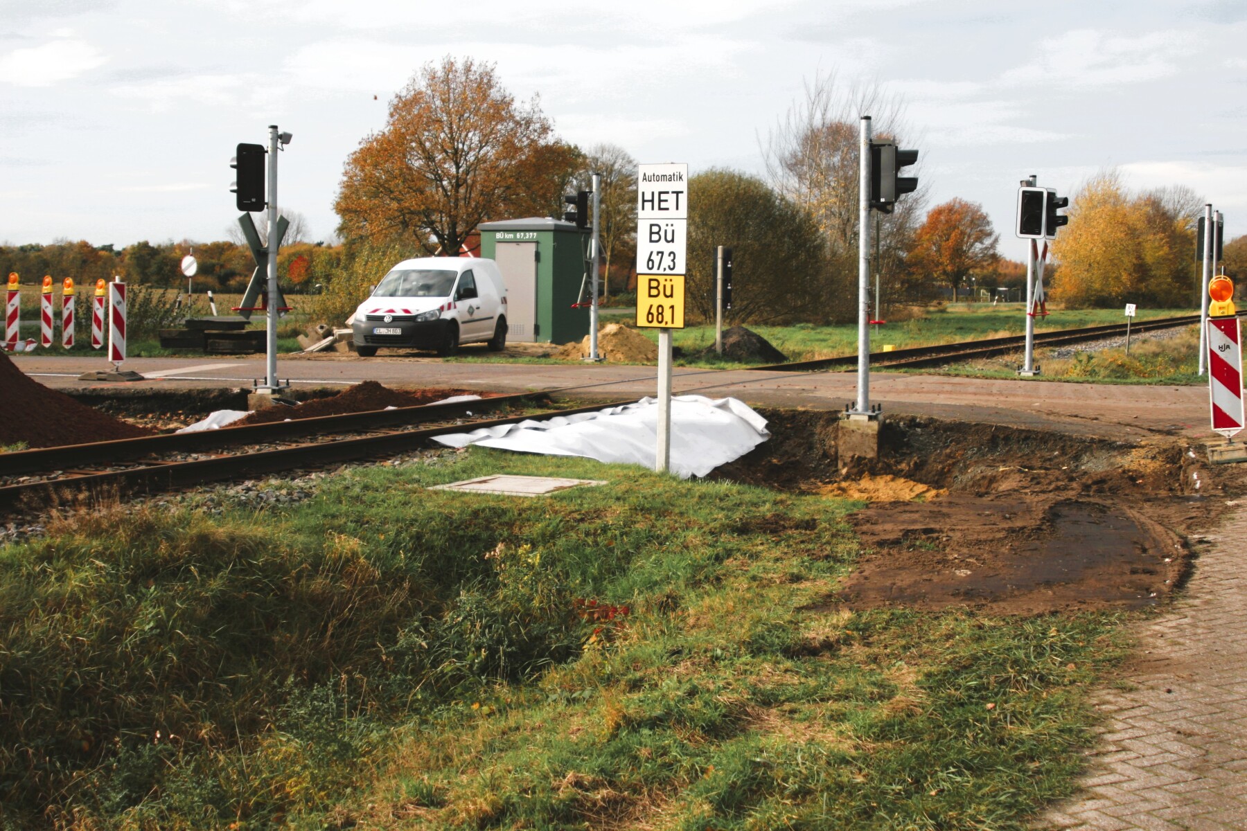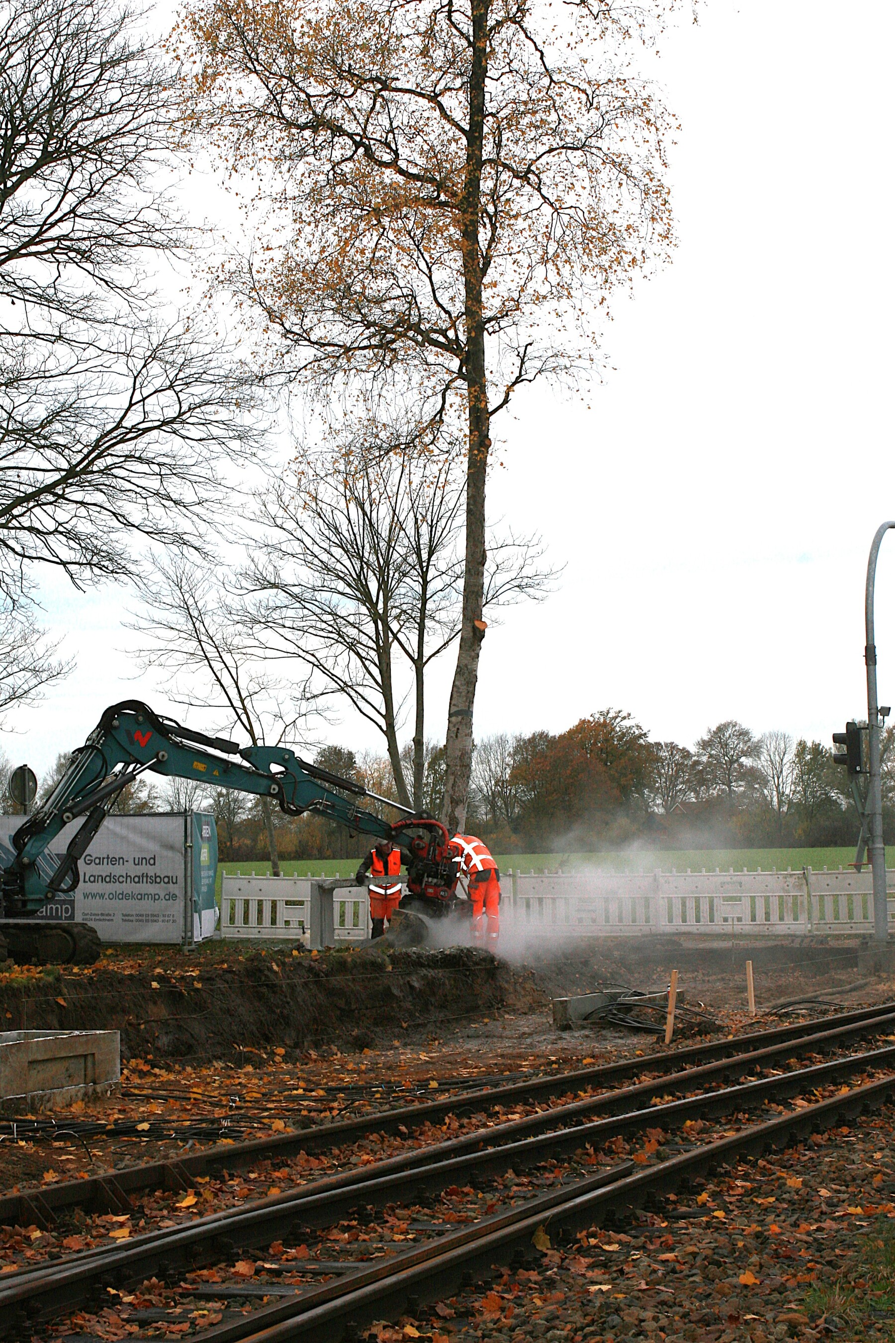 3037-2029 Het was mij opgevallen dat er de laatste weken bij de overweg in de Volzeler Feldstrasse druk gewerkt word. Er stond een “bagger” en er lag een grote hoop grond en ballast