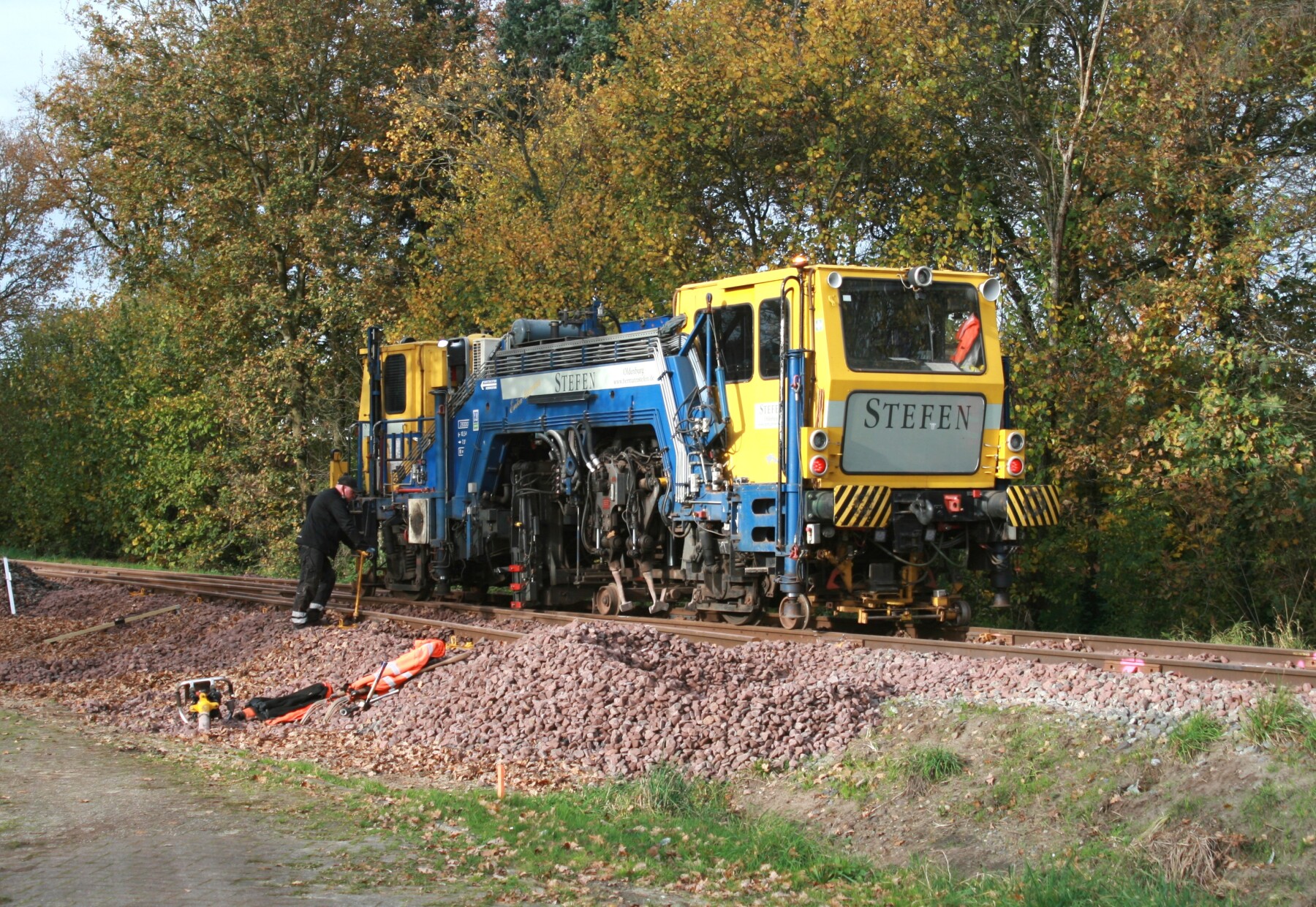3039-3032 Bij de overweg in de Westhook was de aannemer met groot geschut bezig. De nivelleer en opschut machine was wissel 55W14 goed aan het opschudden.. Van een aansluiting op spoor 2 is voorlopig nog geen spraken.