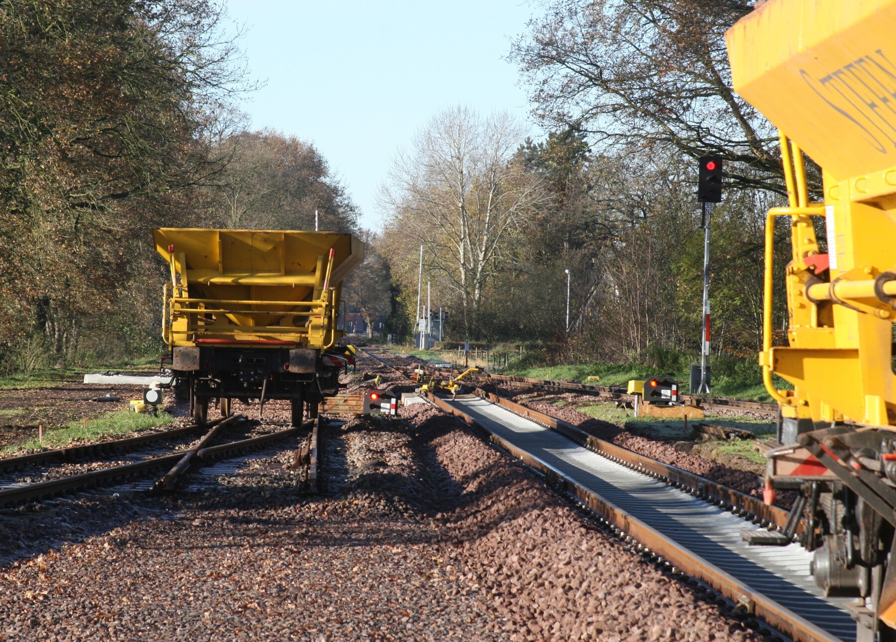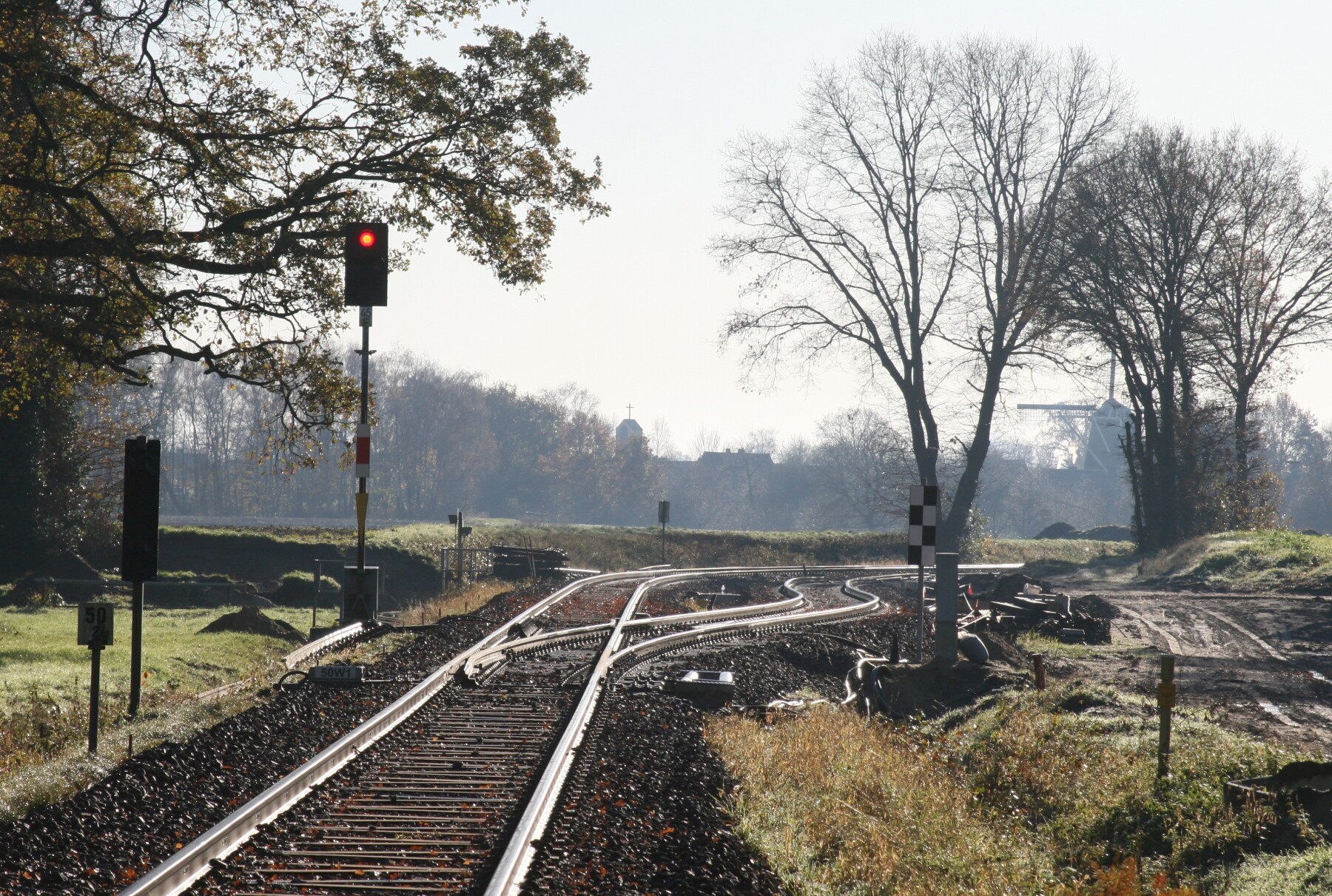 3070-2081 Op de achtergrond is nog net overweg Bu140 Westhoek te onderscheiden. Deze overweg moet voor dubbelspoor worden aangepast, maar aan de overweg en het 2e spoor is nog niets te zien.