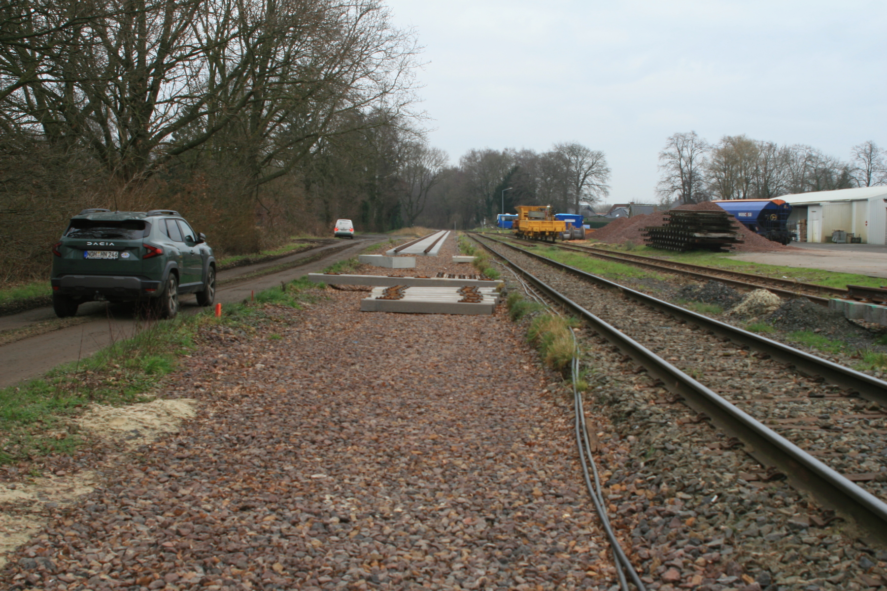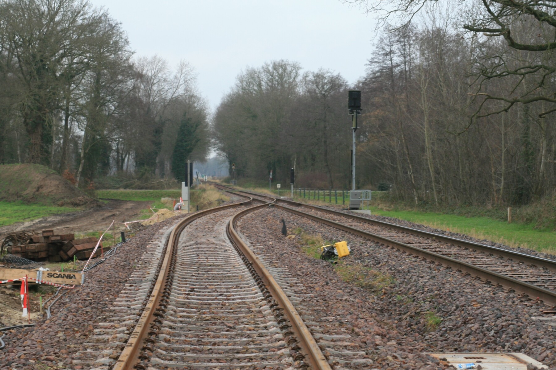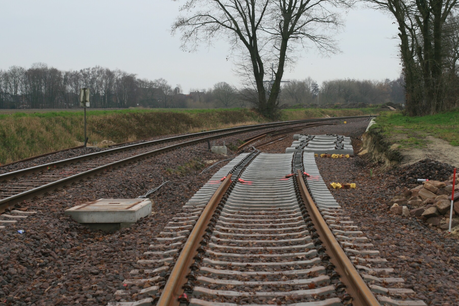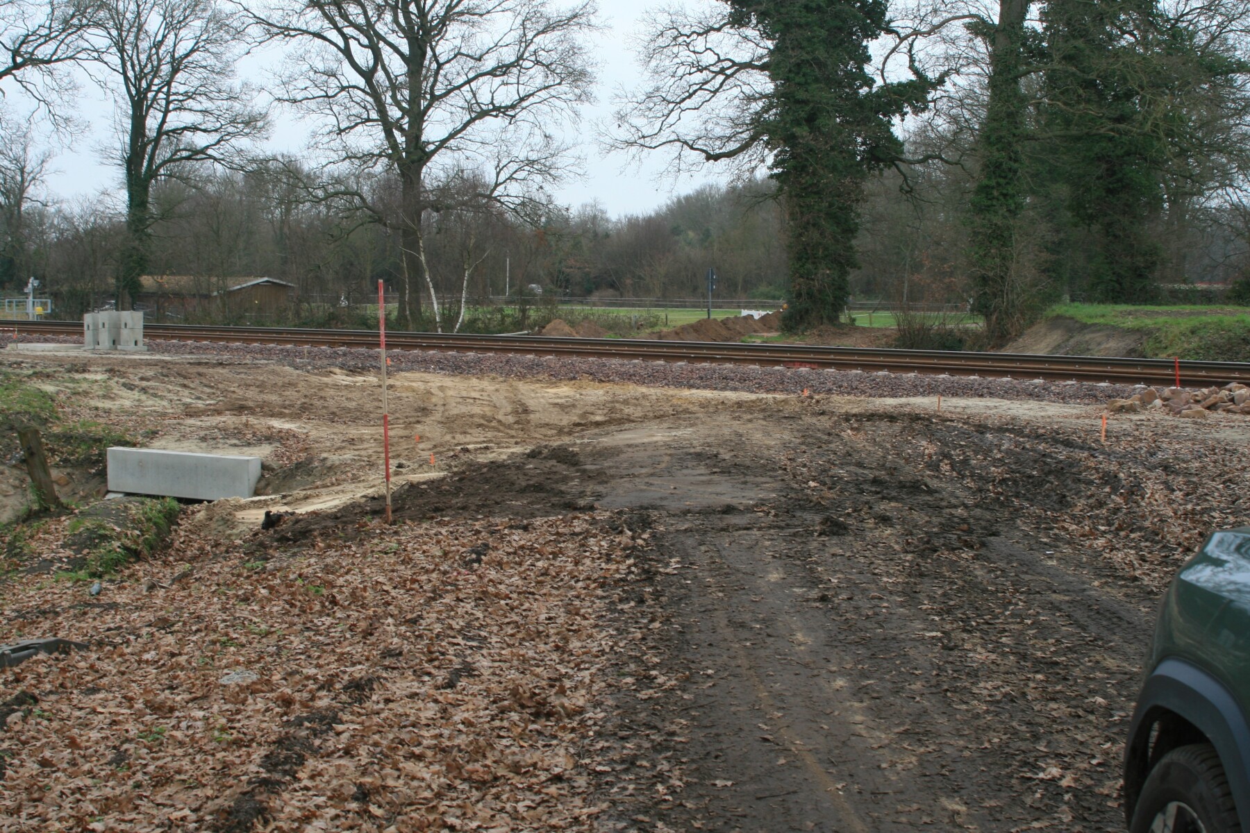 4029-1261 Ook het wissel 55W14 is onderhanden genomen en heeft zijn eerste meters aansluitspoor gekregen. Voorlopig houdt dit net na de overweg even op.