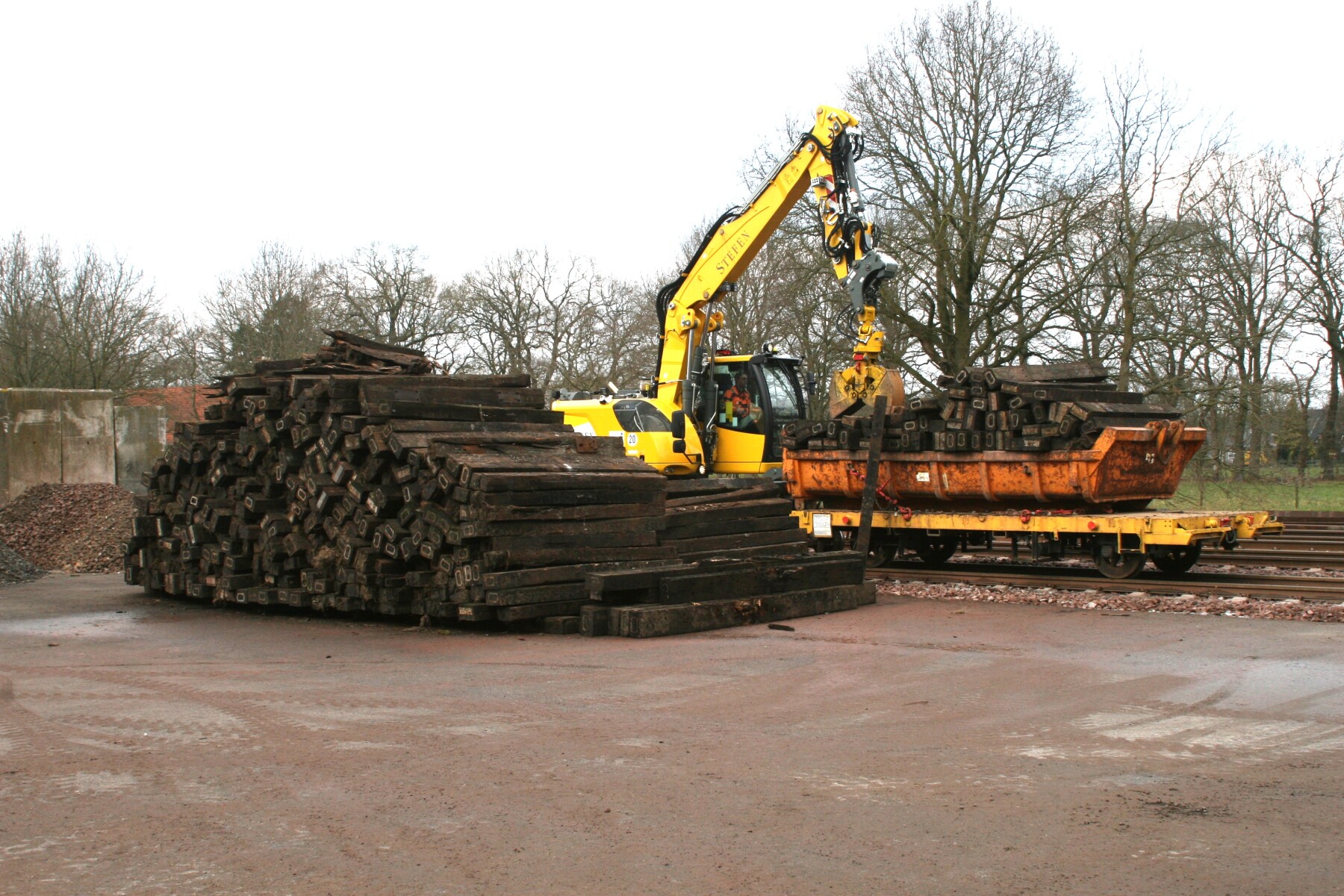 Op Coevorden Vorbahnhof, de containerterminal, was een steeds groter wordende berg ballast te vinden met aan en af rijdende tractoren.