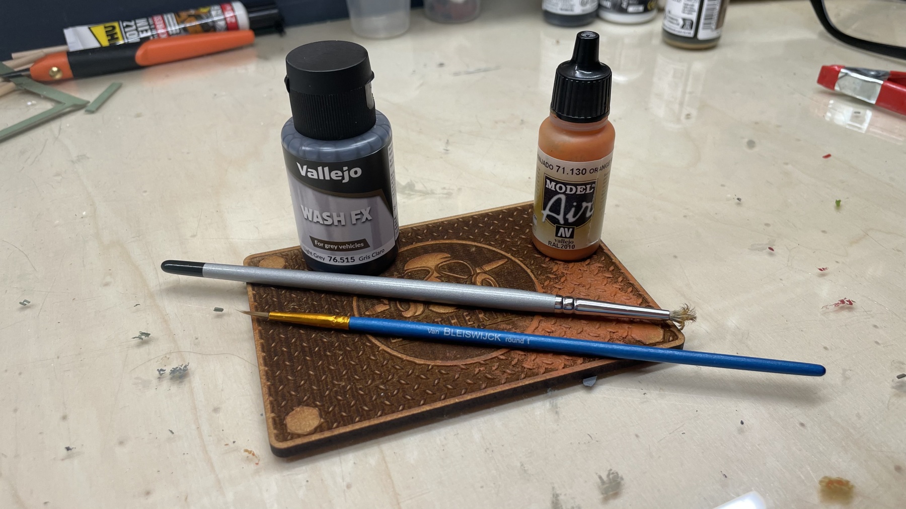Drybrush met oranje roest en de inwendige hoeken wat donkerder maken met zwarte wash.