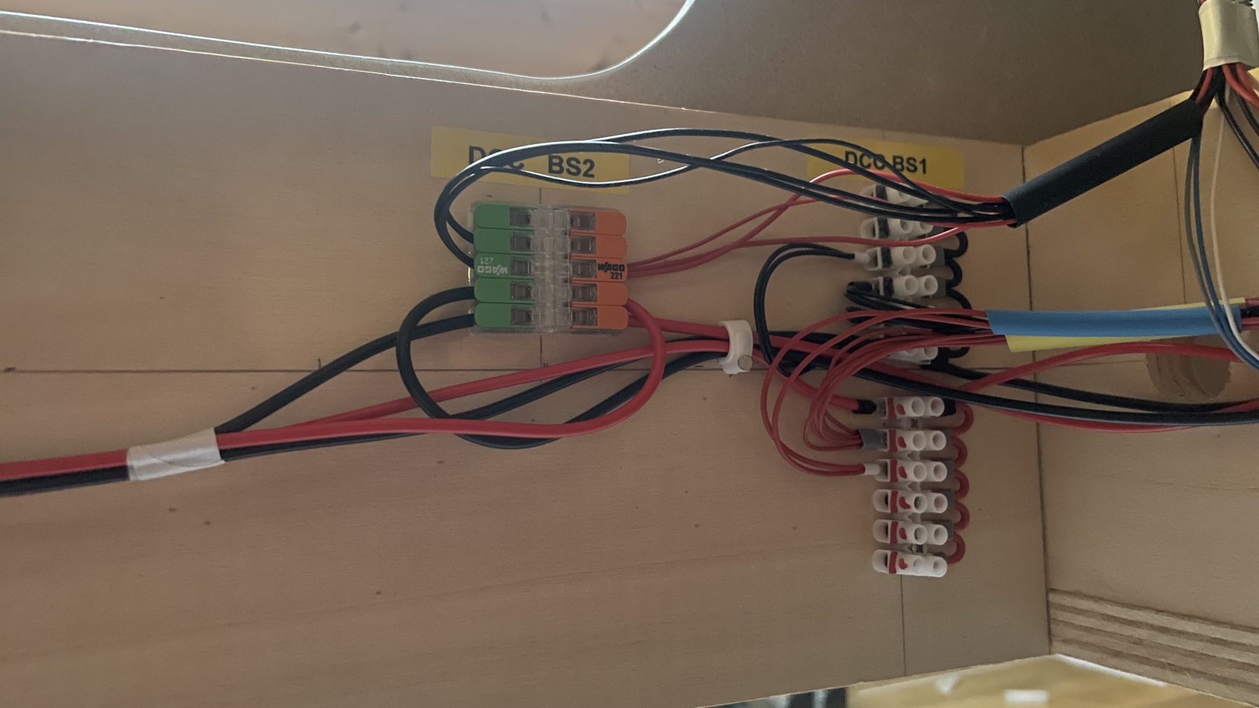 Voor de stroomverdeling wat anders bedacht, 2 stuks 5-voudige Waco klemmen aan elkaar gelijmd. Werkt goed.