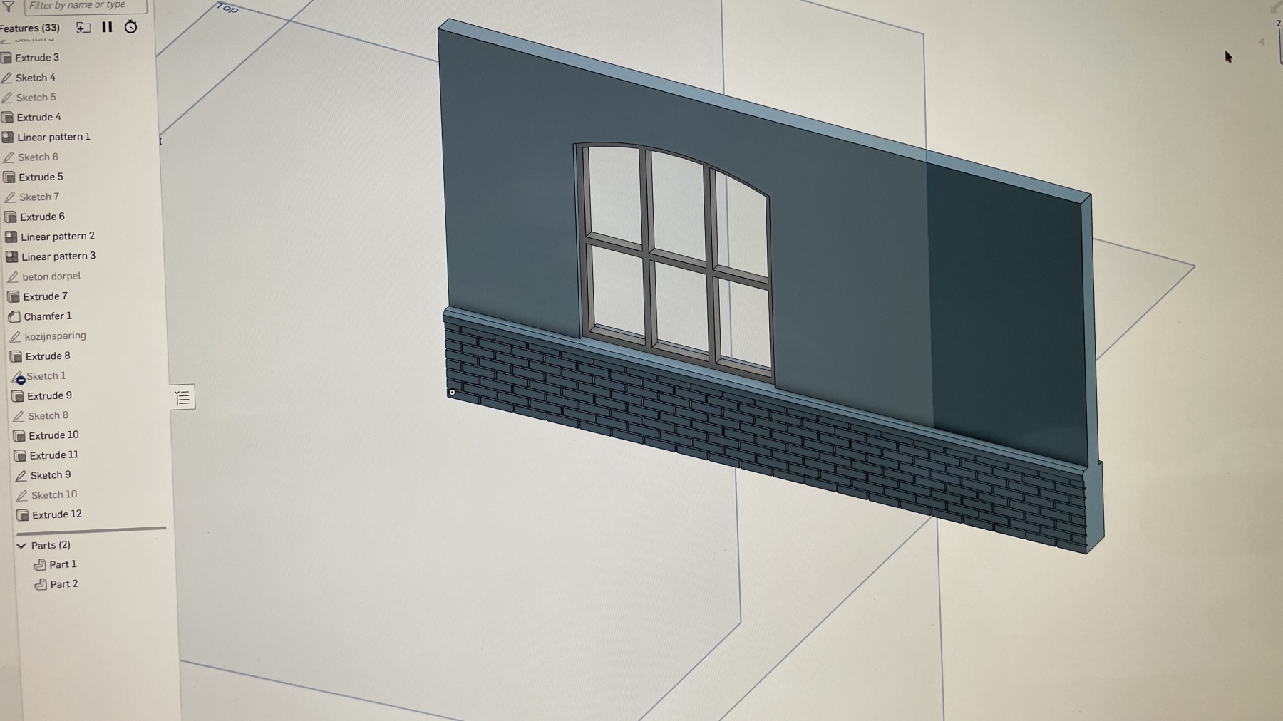 Wordt dus een doorgesneden gebouw. Daarom moet ook de binnenkant er goed uitzien. Voordeel van 3D printen is dat ik 2 zijden van de wand als zichtwerk kan maken.