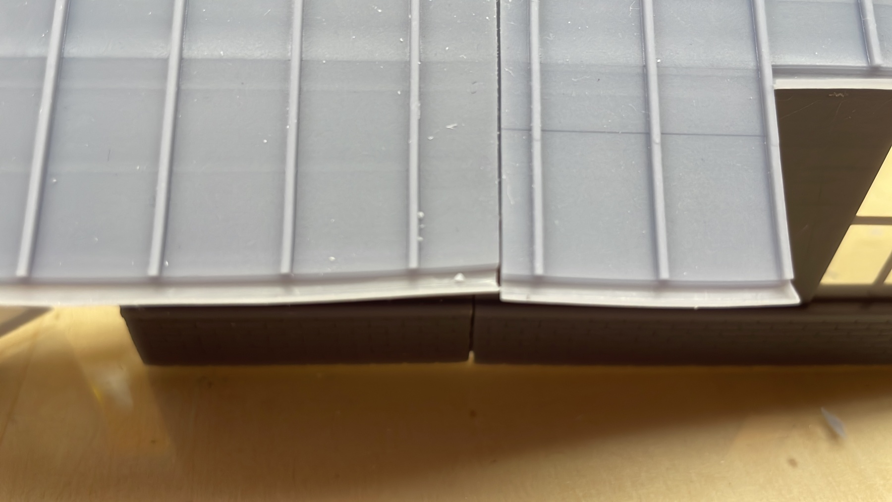 Alleen is dak aan 1 kant best wel stuk (ca 1 mm) gekrompen waardoor de aansluiting bij de goot niet goed is. Ga ik voor deze loods niet aanpassen omdat dit toch de kant is waar je niet tegenaan kijkt. Verschil camoufleer ik tzt wel met iets.