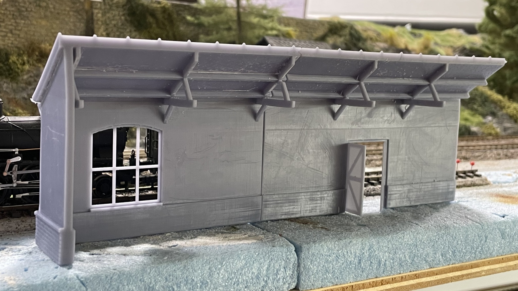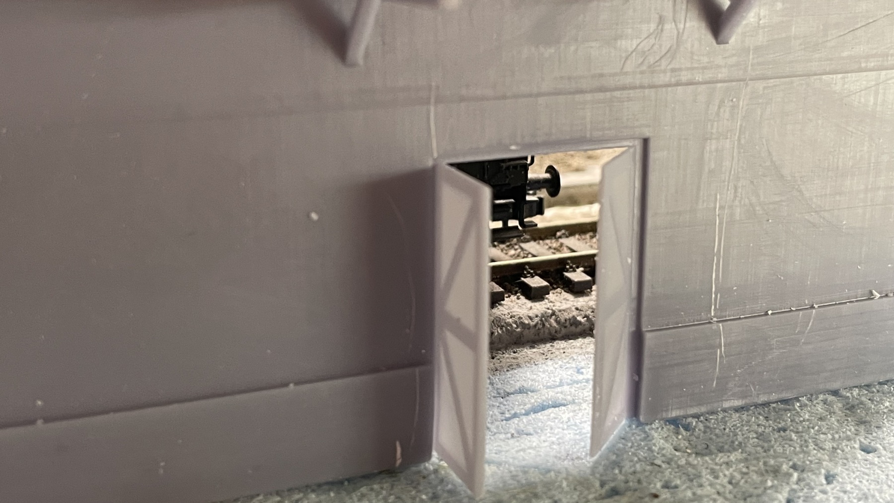 Vanmiddag deel 2 van de goederenloods geprint. Ben er redelijk tevreden mee. De deuren (op dikste punt 0,7 mm dik, zijn prima gelukt. Bedachte koppeling met v- vormige “messing & groef” werkt ook.