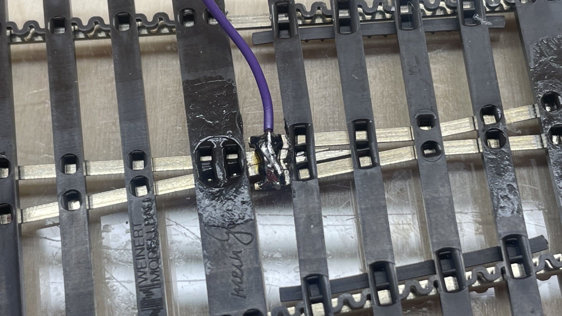 alleen nog wat verbindingen aan de onderkant solderen )voeding wisseltongen en polarisatie hartstuk). Eén keer wisseltongen vergeten en dan heb je leuke uitdaging als hij al op zijn plaats ligt.