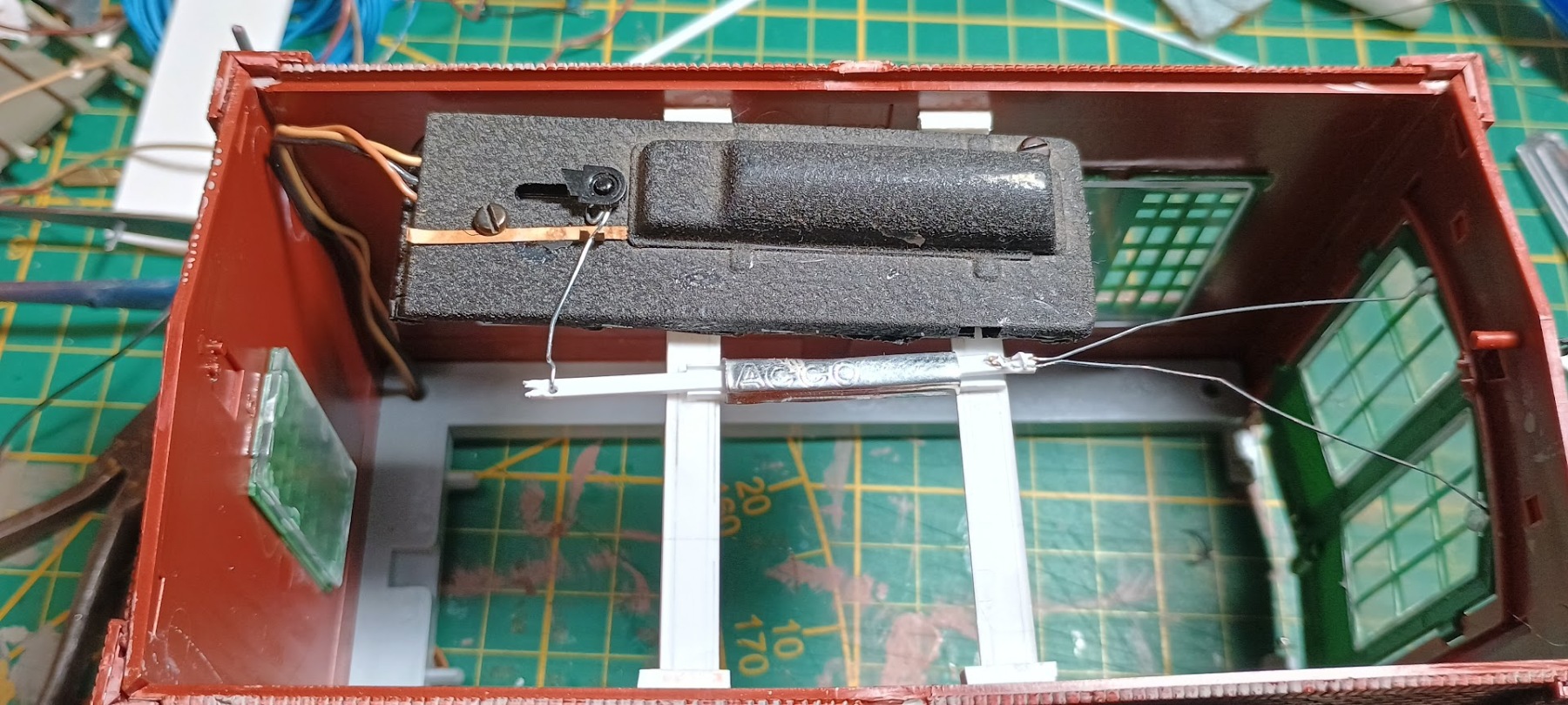 Met het tape een plus en min leiding in de hele lengte van de baan geplakt waar ik alle lantaarns en interieurverlichting als aftakking zo op vast kan solderen.