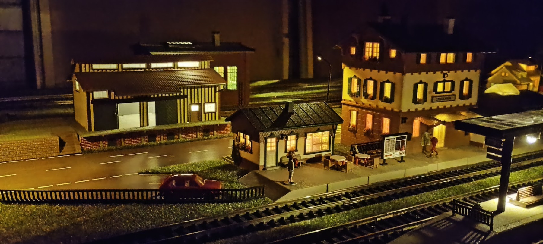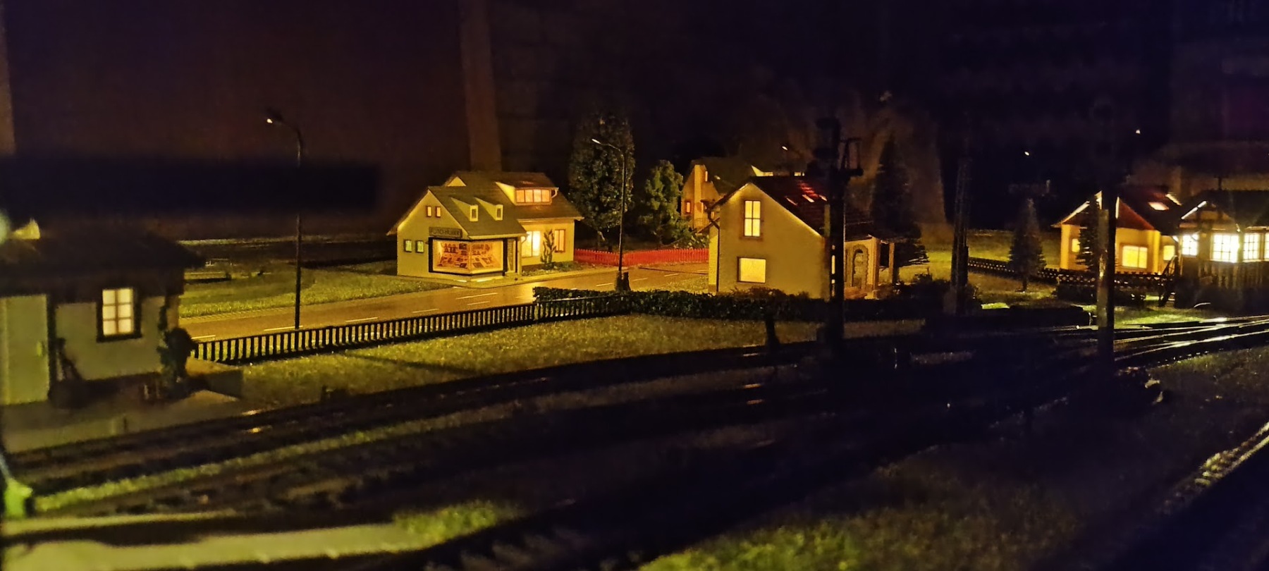 De kleine locloods is geïnstalleerd en aangesloten, alle lantaarns branden.