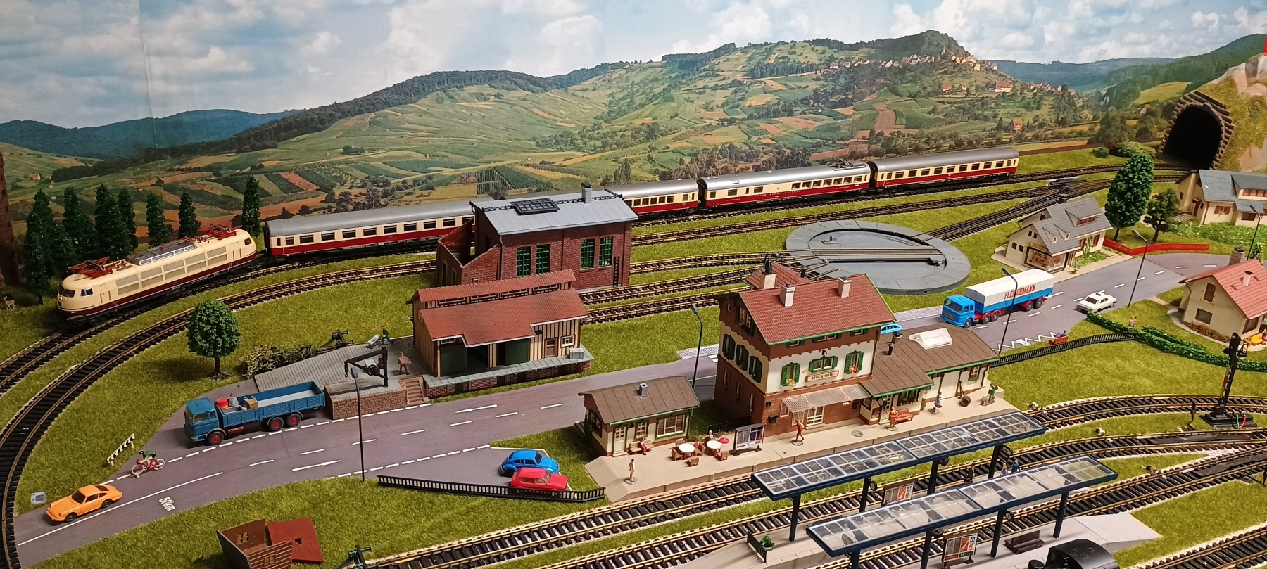 Een Toporama anno 1976 is natuurlijk niet af voor presentatie zonder achtergrond uit de jaren zeventig. Faller begon reeds tweede helft jaren zestig met achtergrond poster nr 515, Löwenstein. Die overigens net als veel bouwpakketten tot op de dag van vandaag geleverd wordt.