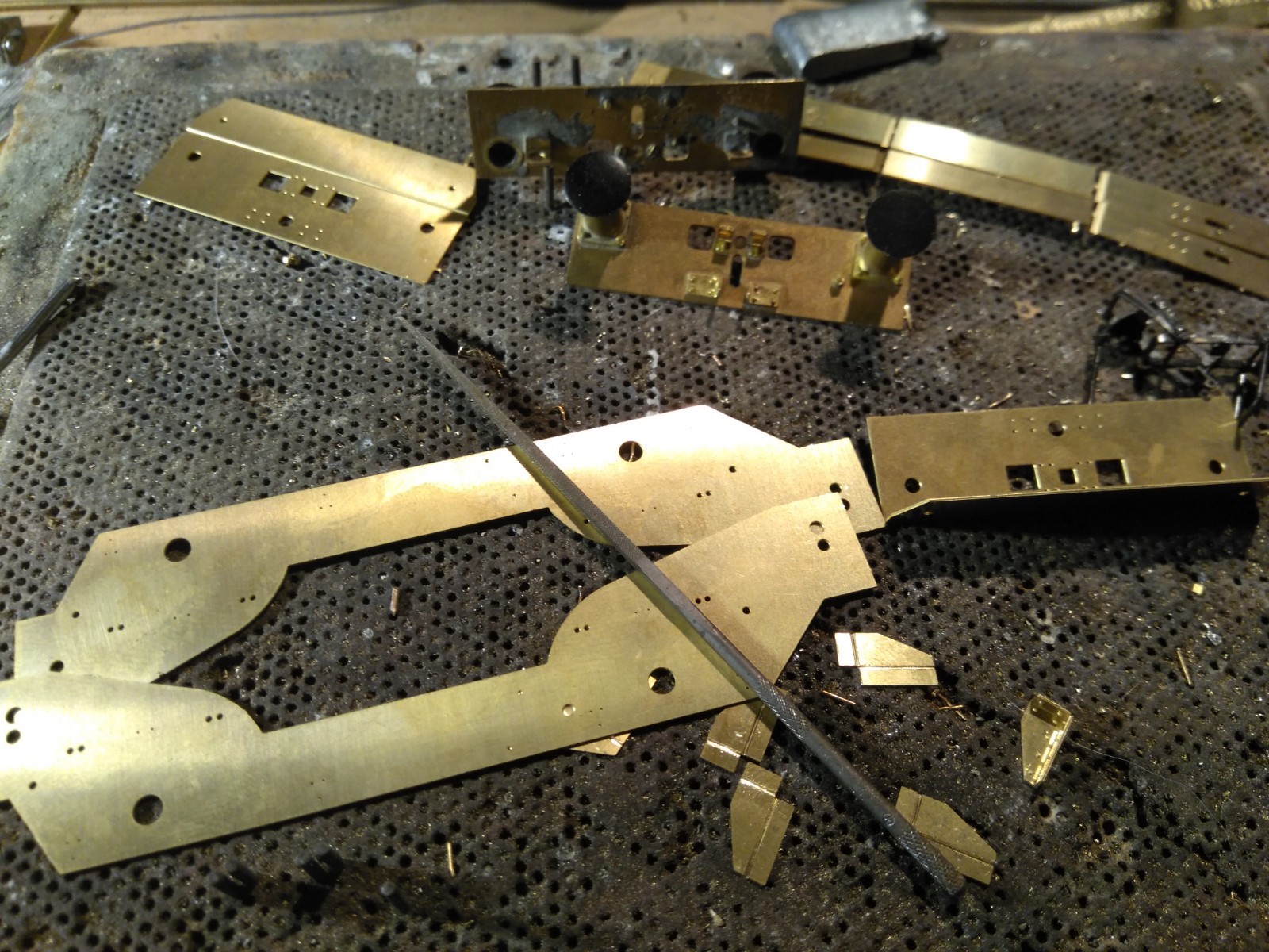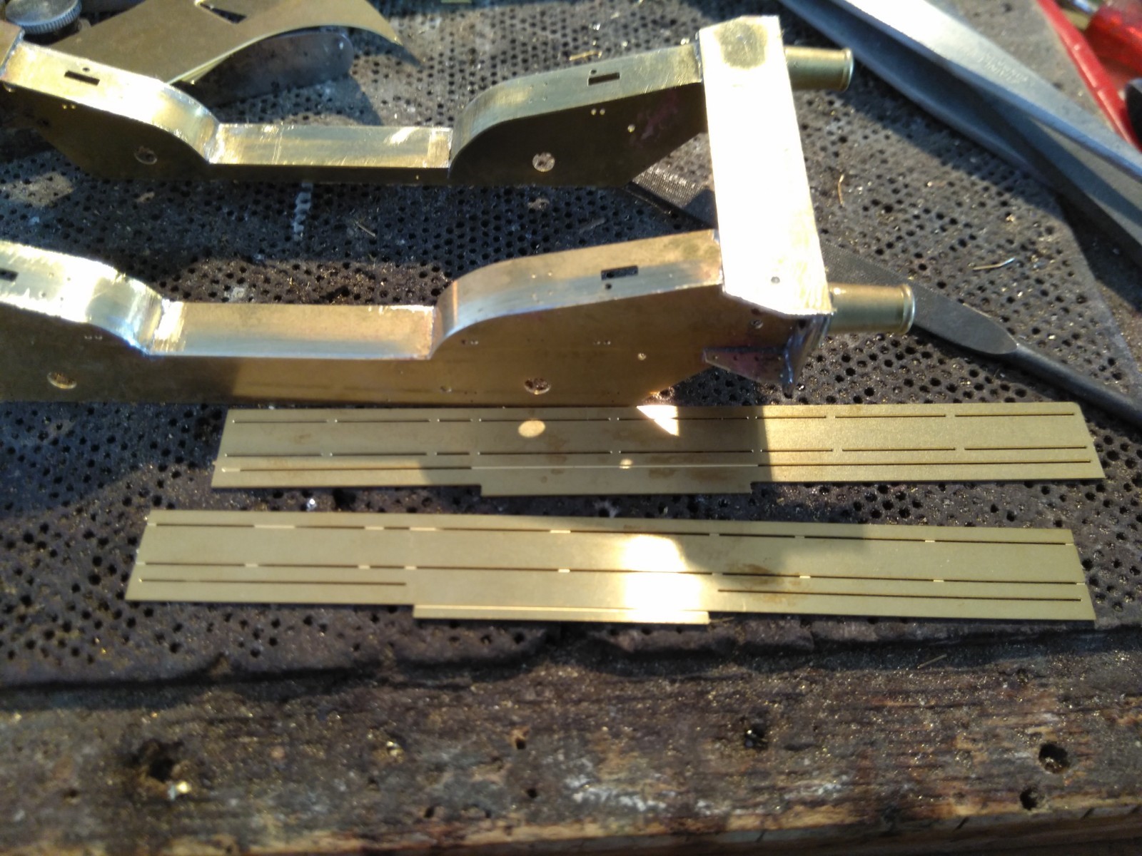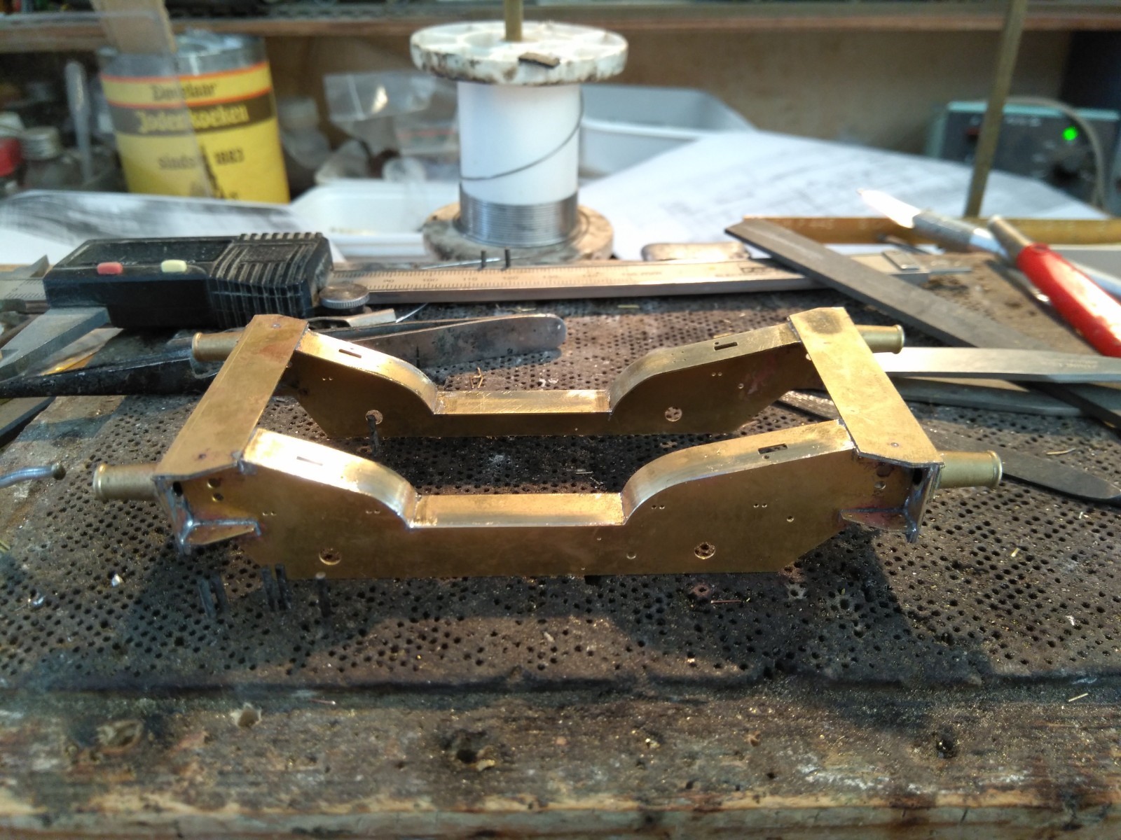 Dat de etsdeel U profielen, alle vouwnaden aan de binnenkant, en mooi in bankschroefje omzetten, verstevigen met soldeer, voor je het erin monteert. Ook hier pas maken/vijlen.
