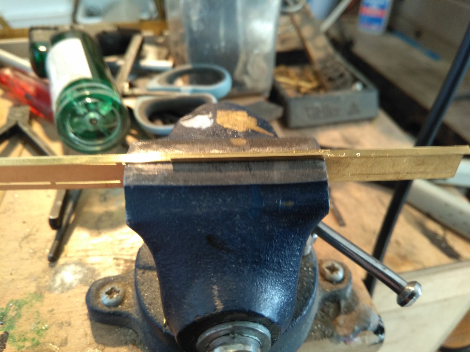 Bij het voorste deel machinistenhuis komt na vouwen een naad. Die wilde ik toch liever niet, omdat je dit aan de buitenkant ziet. Dus opgevuld met 0.4mm draad, en vlak vijlen.