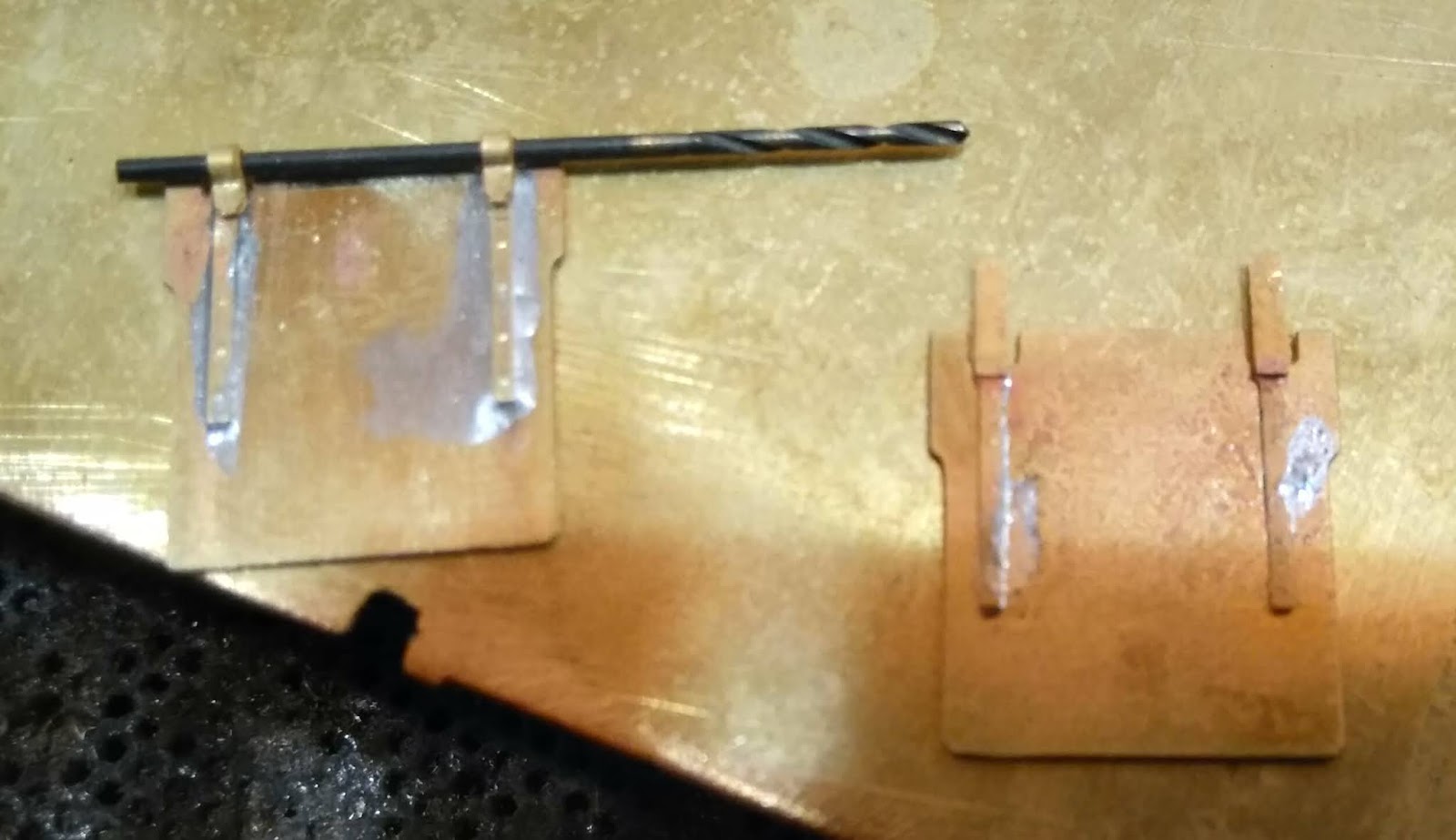 Om de haak draaibaar te houden een onderlegplaatje, met papiertje er tussen, gesoldeerd aan de steel en daarna klein gemaakt.