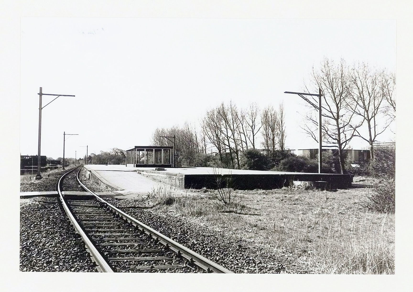 De reizigersdienst is in het voorafgaande jaar opgeheven, de bovenleidingsmasten staan er nog, niet dezelfde als op de vorige foto trouwens, maar de draad is er al niet meer. Een klein gebouwtje dekt het trapgat naar de onderdoorgang af en biedt tegelijk enige beschutting, voor zover de ramen niet weer eens zijn gevandaliseerd tenminste. Het gat in de perronwand is niet duidelijk te zien. Wat een treurnis, vergeleken met de vorige foto.