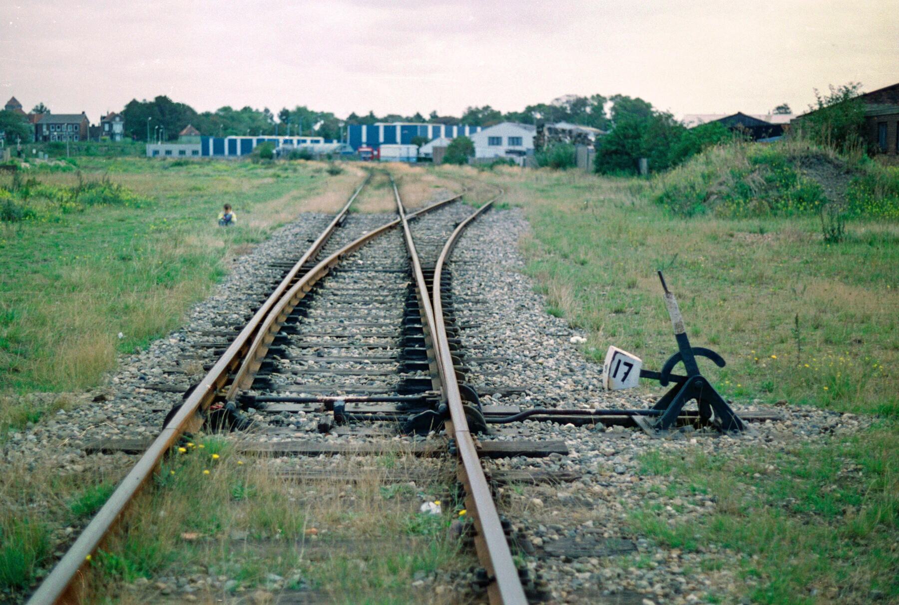 Spoorwerkzaamheden bij het emplacement van IJmuiden. We kijken in noordelijke richting, de fraaie huizen staan aan de Kon. Wilhelminakade. Op de voorgrond de sporen die zo te zien worden/zijn vervangen en de vakwerkmasten van de bovenleiding. In het midden een spoorwerker die niet scherp is, althans niet op de foto, want bewogen. Achter hem een klein houten gebouwtje in typische spoorwegstijl uit die tijd (veel wachtruimtes op perrons hadden destijds dezelfde stijl en constructie, maar dan groter, zoals de wachtruimte op het noordelijke perron van Velsen-Zeeweg tot 1958) met zo te zien een zinken dak. Er staat een schoorsteentje op en er is een uitbouw die zo te zien als WC dient. Uiterst rechts op het spoor een klein werkkarretje.
