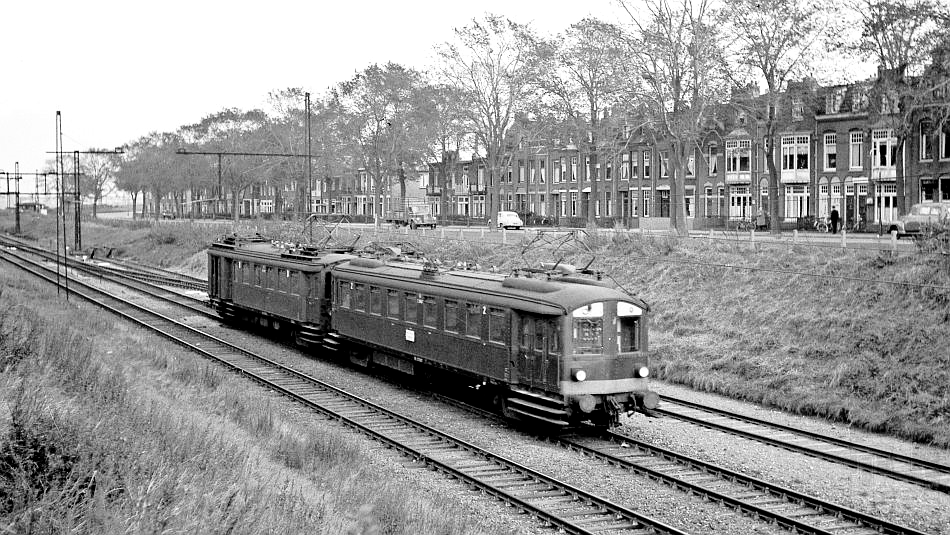 De pendeltrein van IJmuiden naar Velsen-IJmuiden Oost, bestaande uit twee motorrijtuigen Mat'24, is zojuist vertrokken uit IJmuiden en zal zo dadelijk stoppen te IJmuiden-Julianakade, waarvan we het gebouwtje links op de achtergrond al kunnen zien liggen. De trein reed hier door de geul tussen de Wilhelminakade, waar de fotograaf stond, en de Julianakade aan de overkant. Daar nadert juist een open vrachtwagen (een Volvo?), terwijl we rechts daarvan een forse witte auto zien, het lijkt wel een Rolls-Royce of Bentley, type Silver Cloud/S-Series. Zo'n auto zou je in IJmuiden niet gauw verwachten, hoewel er in de vis en de scheepvaart door sommigen goed verdiend werd.