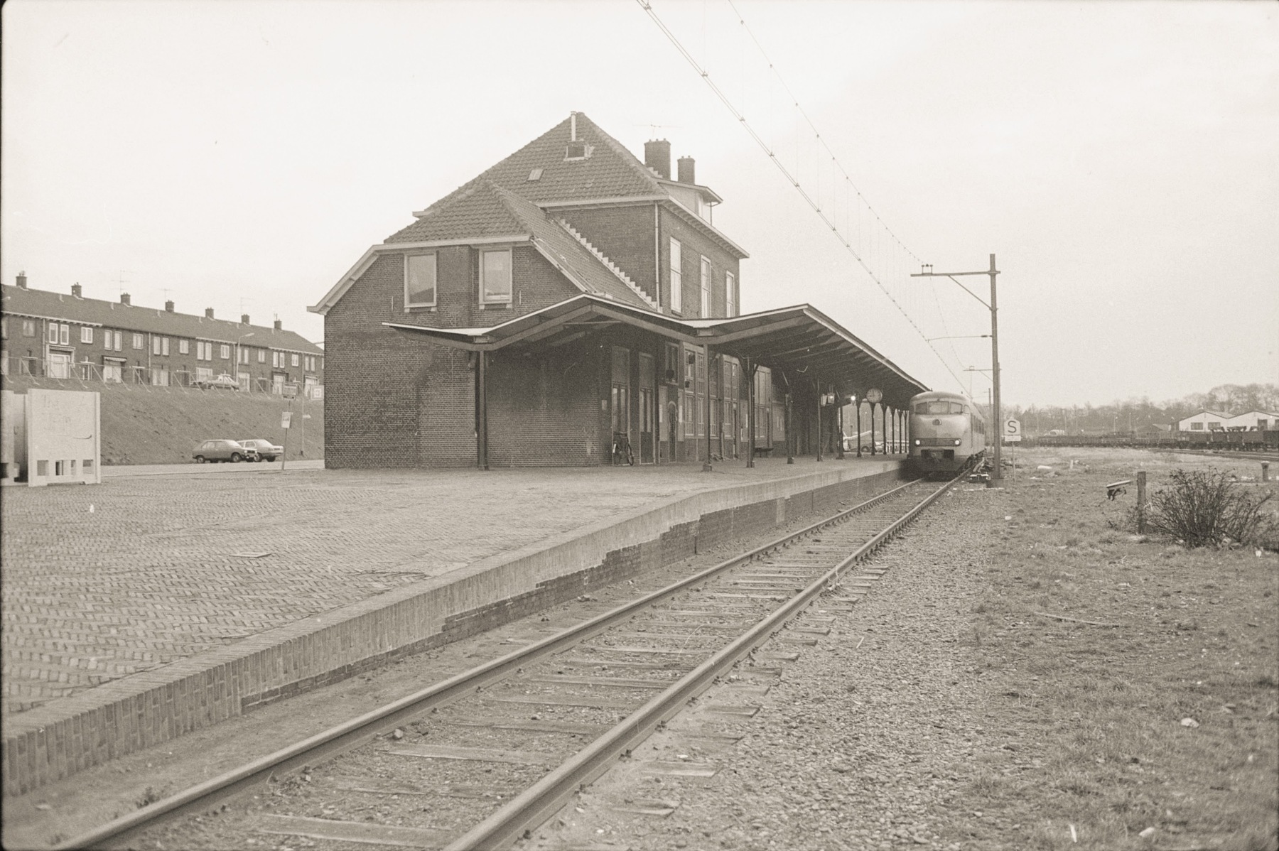 Het tweede perron is allang weg, slechts één perronspoor resteert, met daarachter een kale vlakte. De karakteristieke vakwerkmasten voor de bovenleiding zijn in de loop van de jaren 70 verdwenen en vervangen door eenvoudige masten van het standaardtype. Links heeft een urinoir de plek ingenomen van het toiletgebouw dat er tot 1973 stond. Rechts, op de overgebleven sporen van het emplacement, staan overbodig geworden kolenbakken opgesteld. Op het stationsplein zien we een BMW 3-serie en een Peugeot 104. Daarboven, op de Kon. Wilhelminakade, een forse Japanner, een Datsun Laurel als ik het goed zie.