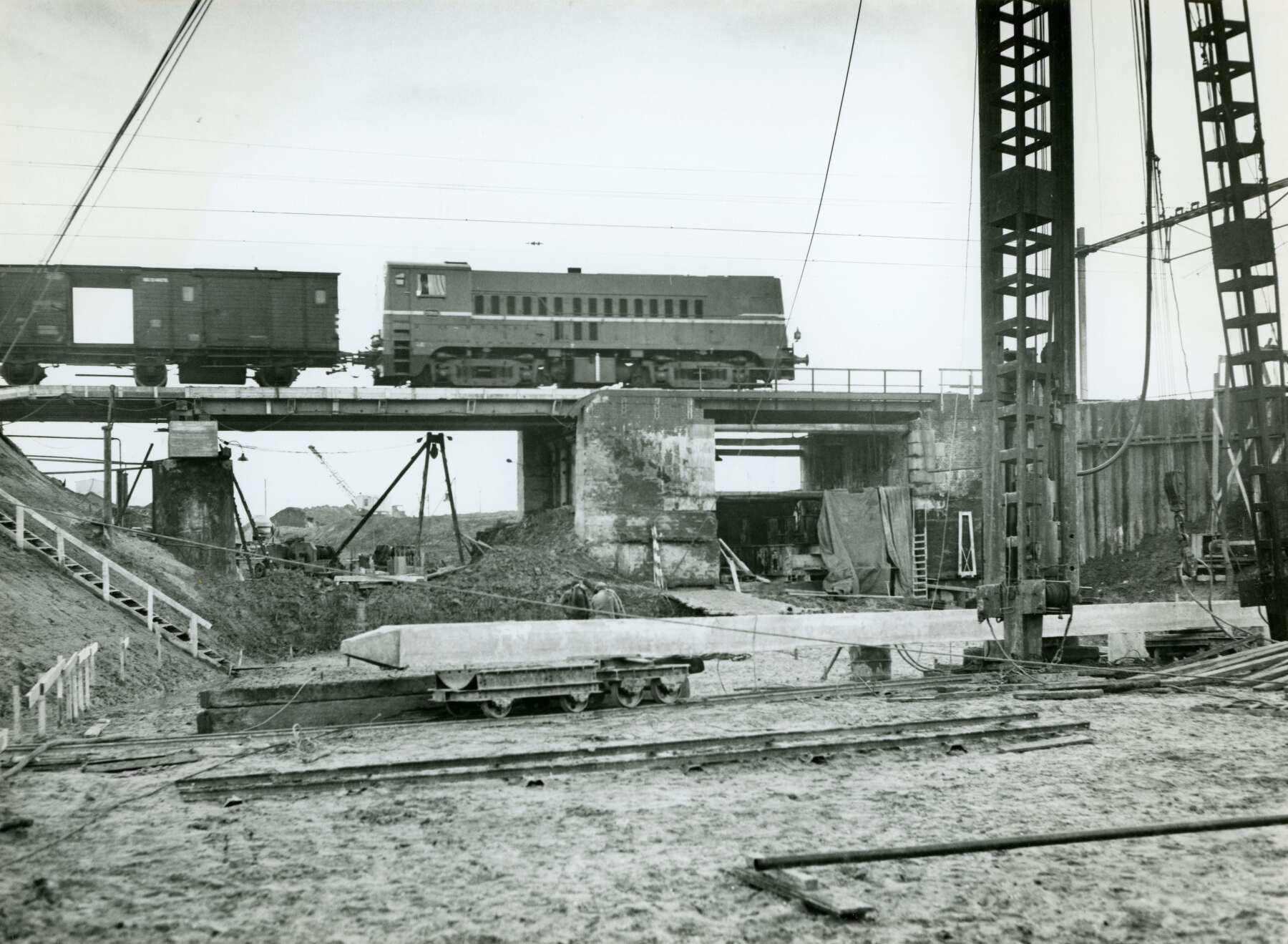 We kijken in westelijke richting, in de richting van Beverwijk steekt een 2200 de tijdelijke brug over, met daarachter een drie-assige wagen (is het een snelgoedwagen?) waarvan de schuifdeuren aan beide zijden openstaan.