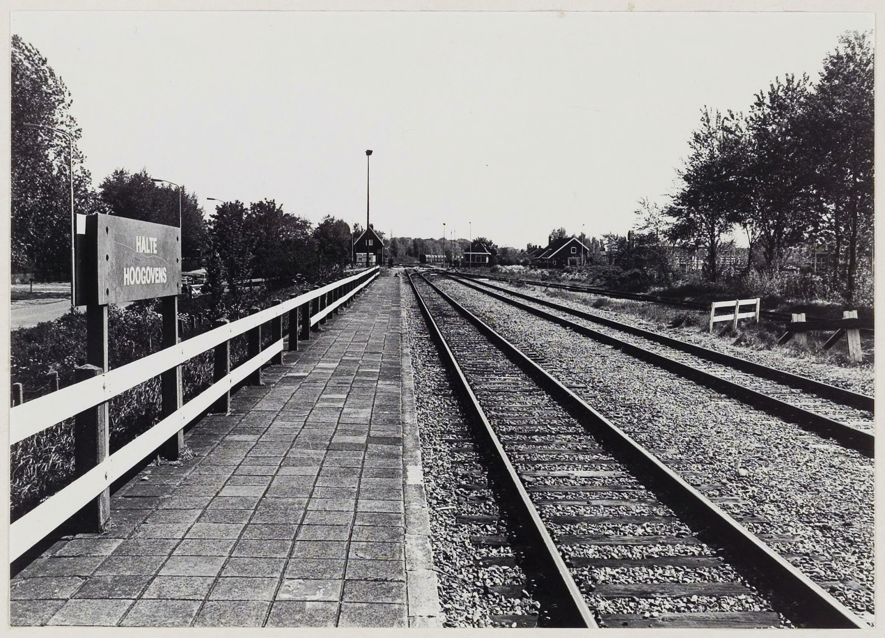 Deze foto dateert uit 1977, de halte Hoogovens was toen al twintig jaar niet meer als NS-halte in gebruik. Toch ziet het eruit alsof er elk moment een trein langs het perron tot stilstand kan komen om reizigers te laten uit- en instappen. Misschien in beheer bij de Stoomclub Hoogovens? Foto Piet Korpershoek, Collectie Gemeente Velsen via NHA, inv.nr 10615.