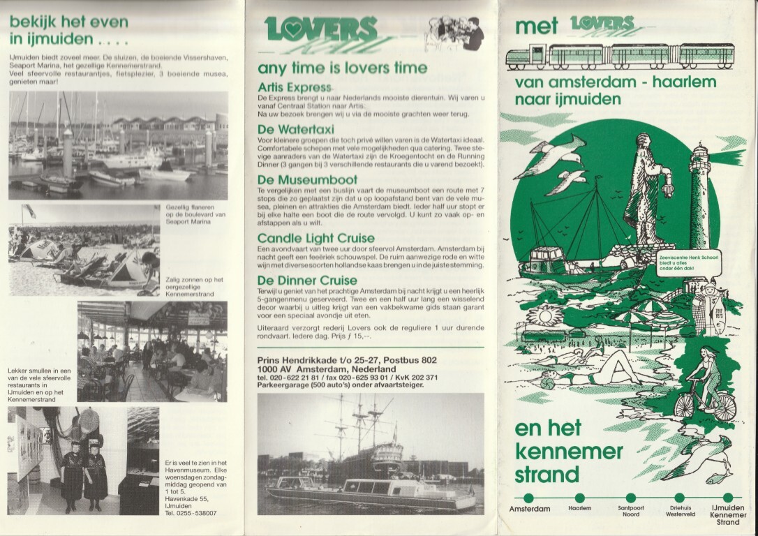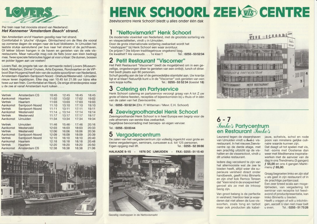 Pas bij het geheel open vouwen en omdraaien zie je de dienstregeling. Waarschijnlijk met opzet zo gedaan want dan zie je de reclame voor Henk Schoorl Zeevis Centre in zijn geheel. Ik heb sterk het vermoeden dat zij iets meer belang in Lovers hadden dan alleen een stukje van de folder in gebruik nemen... De aansluitende bus wordt aangeprezen als zijnde rijdend naar het strand of de jachthaven dus naar de boot naar Newcastle was ook mogelijk en werd ook (soms) zo uitgevoerd. Ik kan me niet herinneren dat er een gat van 4 uur in de dienstregeling zat maar het geheugen van een mens is niet altijd betrouwbaar. Ook dat de eerste trein vanuit Amsterdam pas om 10.45 vertrok is niet bepaald slim om veel reizigers te trekken. 08.45 had ik beter gevonden maar dan zit je nog in de spitsuren en waarschijnlijk toen daarom geen tijdpad gekregen. Of er veel reizigers in de 18.45 vanuit Amsterdam zullen hebben gezeten? Als je met de boot uit Newcastle aangekomen was, kan je wel mee met de 11.46 naar Amsterdam maar als de boot zoals nu rond 17.30 vertrekt dan kan je maar 7 minuten in Amsterdam zijn. De volgende aankomst te IJmuiden is om 17.34 en dus te laat om de boot terug te halen. Dat "gat" in de dienstregeling hielp dus ook niet om bootreizigers te bedienen. Op de folder is echter geen datum terug te vinden. Dus dit kan ook een folder van het begin zijn geweest (nieuw, eerst proberen) of later (het werkt niet, dus wat minder ritten om geld te besparen).