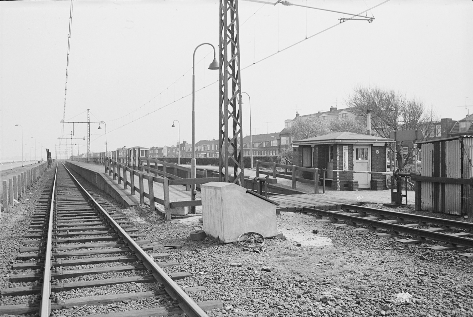 Aanvulling: overigens is dat "oorspronkelijke" ook relatief, want die abri verscheen aan het begin van de jaren zeventig. Daarvóór stond er aan de westkant een heel aardig bakstenen gebouwtje, dat gelijkenissen vertoonde met de soortgenoot bij Velsen-Zeeweg. Hier is dat gebouwtje te zien in 1968: