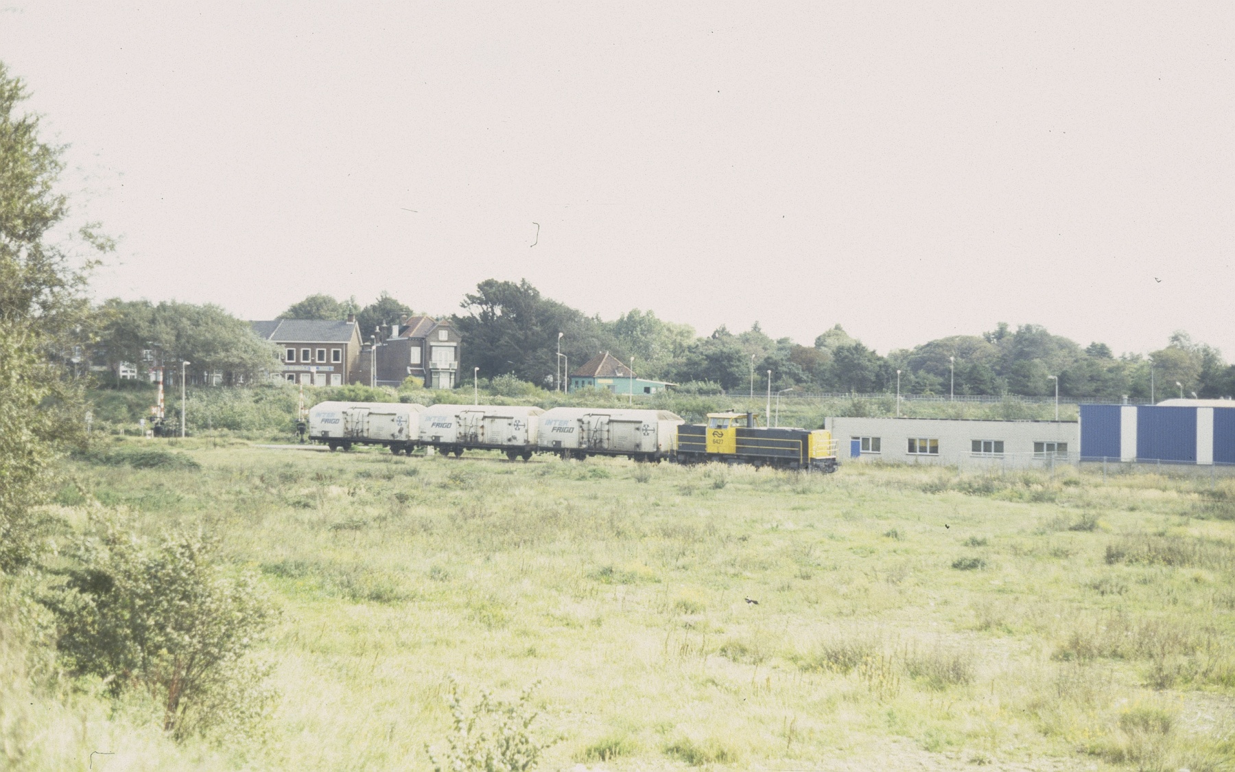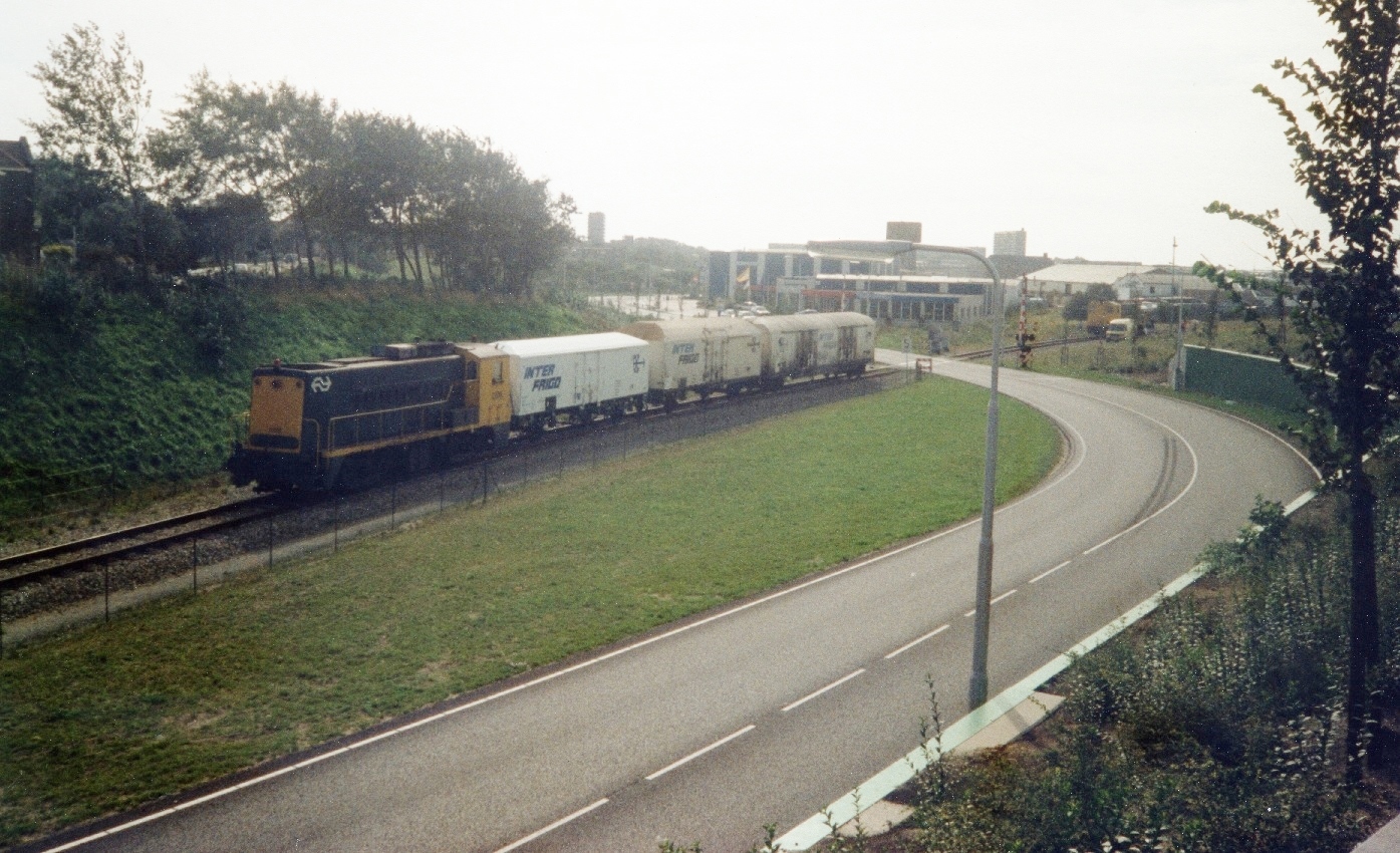 Twintig jaar later, in de zomer van 1991, kijken we hier oostwaarts. Op beide overgebleven sporen staan Interfrigo koelwagens. In die tijd werd vooral het spoor rechts gebruikt, omdat het overdekte laadperron niet geschikt was voor het gebruik van heftrucks. Toen het Visstation werd gebouwd werd alles nog met de hand geladen.