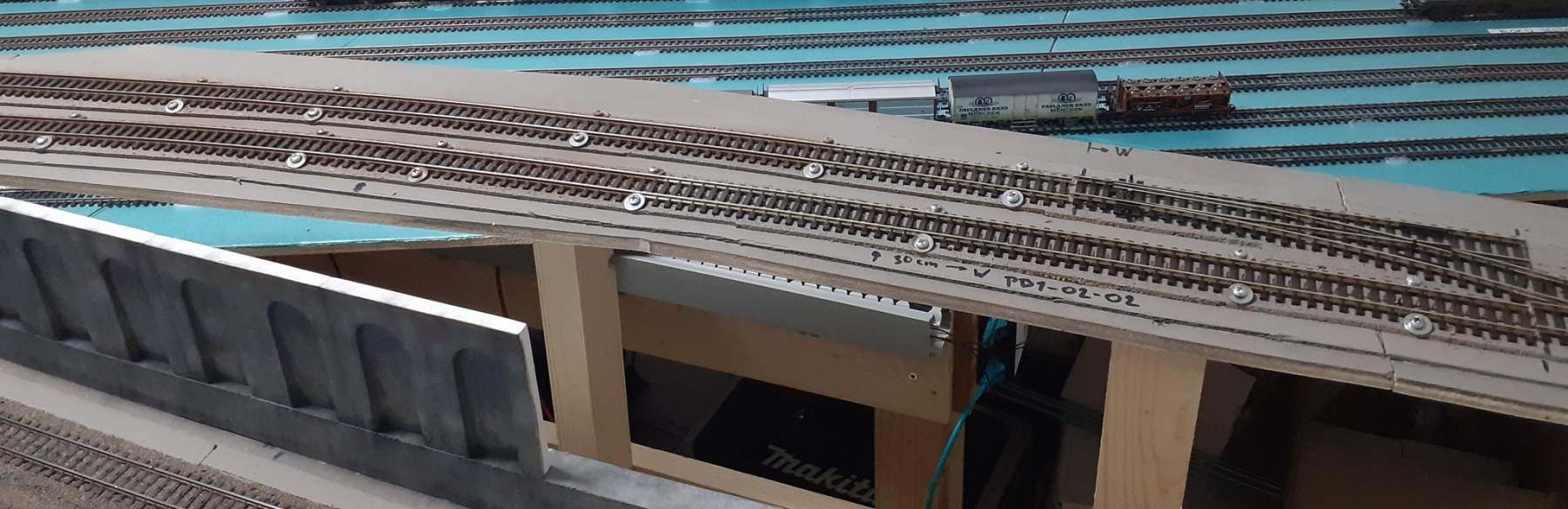 Ook het bovenste paradespoor verder verlengt tot aan de wissels. Puko's zijn onderling aan elkaar gesoldeerd. Ook de railstaven voorzien van een roestkleur.