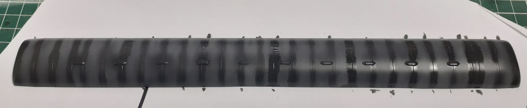 Daarna voor de verwering XF-54 Dark Sea Grey (90%) met XF-1 Flat Black (10%). Dit is gespoten tussen de richels (de dakuitlaten (??) niet meenemen). Na droging nog een laag zijdeglans er over.