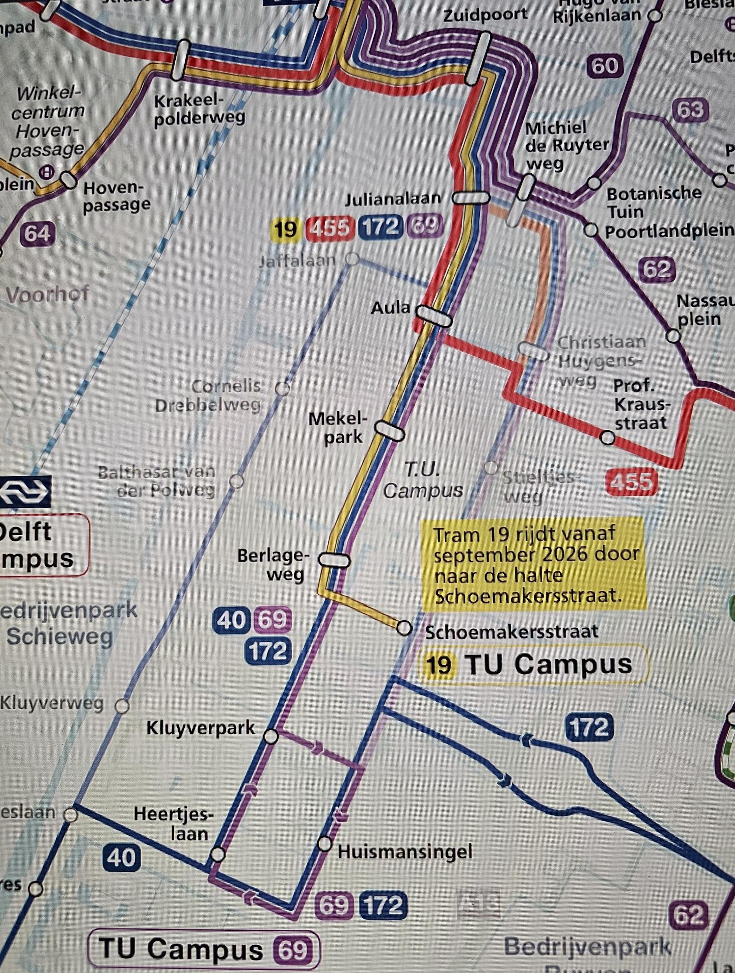 Zou het er dan toch van komen? Bij de HTM nog niets van te zien, EBS meldt ook verder niets, maar kijk: hun lijnennetkaart Delft onthult dat tram 19 in september 2026 zou moeten gaan doorrijden.